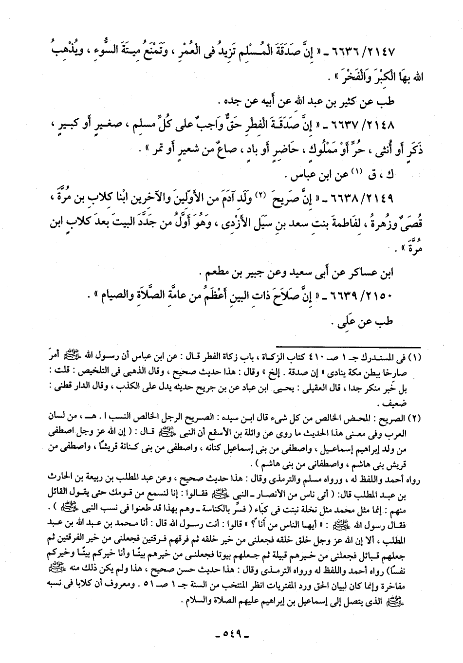 2149/ 6638 - "إِنَّ صَريحَ (¬2) وَلَد آدَمَ من الأَوّلِينَ والآخِرين ابْنا كِلابِ بن مُرَّةَ، قُصَىٌ وزُهرةُ، لِفَاطمةَ بنتِ سعد بنِ سَيَل الأزدِى، وَهُوَ أَوَّلُ من جَدَّدَ البيتَ بعدَ كلابٍ ابن مُرَّةَ".