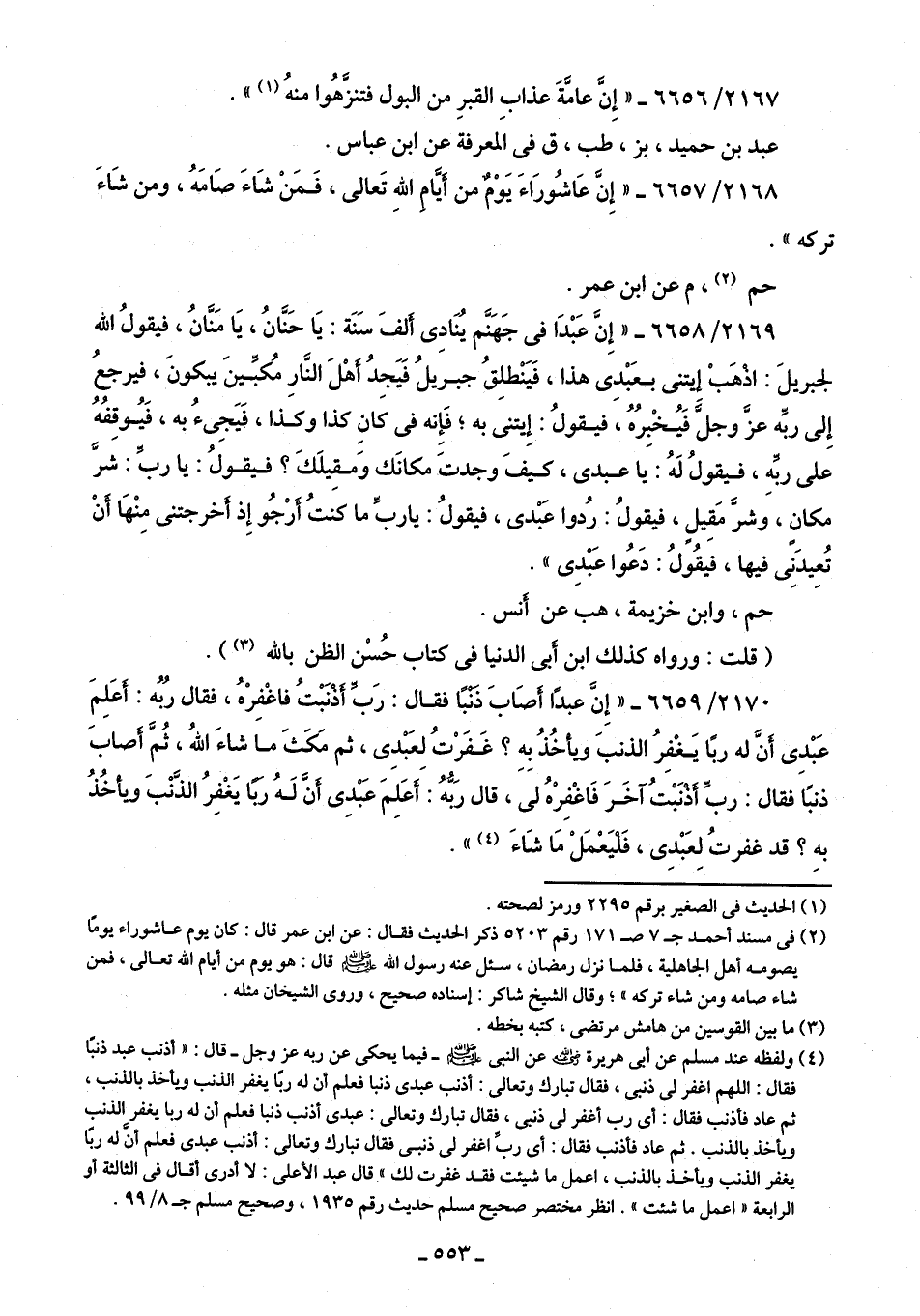 2169/ 6658 - "إِنَّ عَبْدَا في جَهَنَّم يُنَادِى ألفَ سَنَة: يَا حَنَّانُ، يَا مَنَانُ، فيقولُ اللَّه لجبريلَ: اذهَبْ إيتنى بعَبْدِى هذا، فَيَنْطلِقُ جبريلُ فَيَجدُ أَهْلَ النَّارِ مُكبِّينَ يبكونَ، فيرجعُ إِلى ربِّه عزَّ وجلَّ فَيُخْبِرُهُ، فيقولُ: إِيتنى به؛ فَإِنه في كَانِ كذا وكذا، فَيَجِئُ به، فَيُوقِفُه على ربِّهِ، فيقولُ لَهُ: يا عبدى، كيفَ وجدتَ مكانَك وَمقِيلَكَ؟ فيقولُ: يا ربِّ: شرَّ مكان، وشرَّ مَقِيلٍ، فيقولُ: رُدوا عَبْدى، فيقولُ: ياربِّ ما كنتُ أرْجُو إِذ أخرجتنى مِنْهَا أنْ تُعِيدَنِى فيها، فيقُولُ: دَعُوا عَبْدِى".