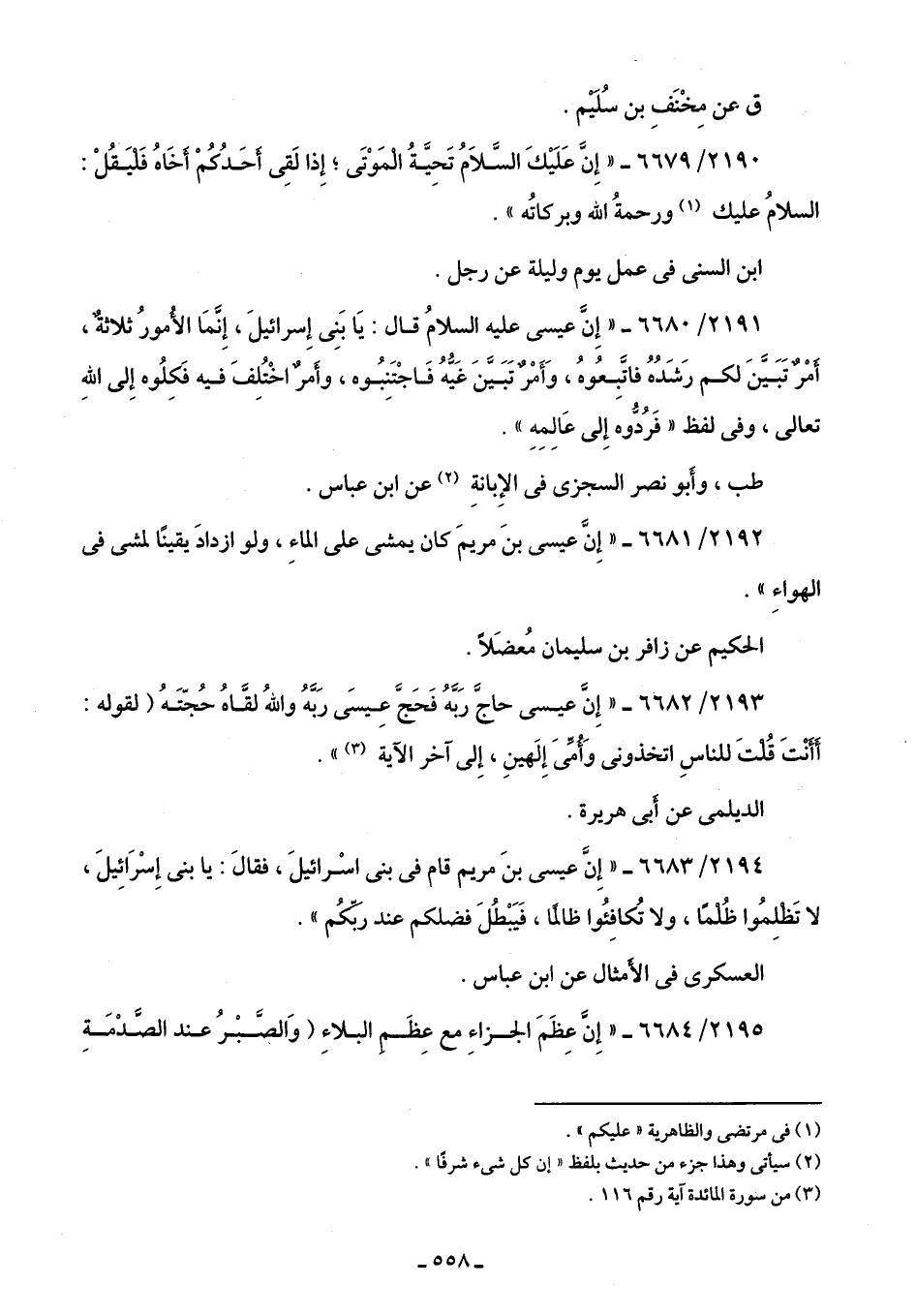 2191/ 6680 - "إِنَّ عيسى عليه السلامُ قال: يَا بَنِى إِسرائيلَ، إِنَّمَا الأُمورُ ثلاثةٌ، أمْر تَبَينَ لكم رَشَدُهُ فاتَبِعُوهُ، وَأَمْرٌ تَبَيَّنَ غَيُّهُ فَاجْتَنِبُوه، وأمرٌ اخْتُلِفَ فيه فَكِلُوه إِلى اللَّهِ تعالى، وفى لفظ "فَرُدوه إِلى عَالِمِهِ".