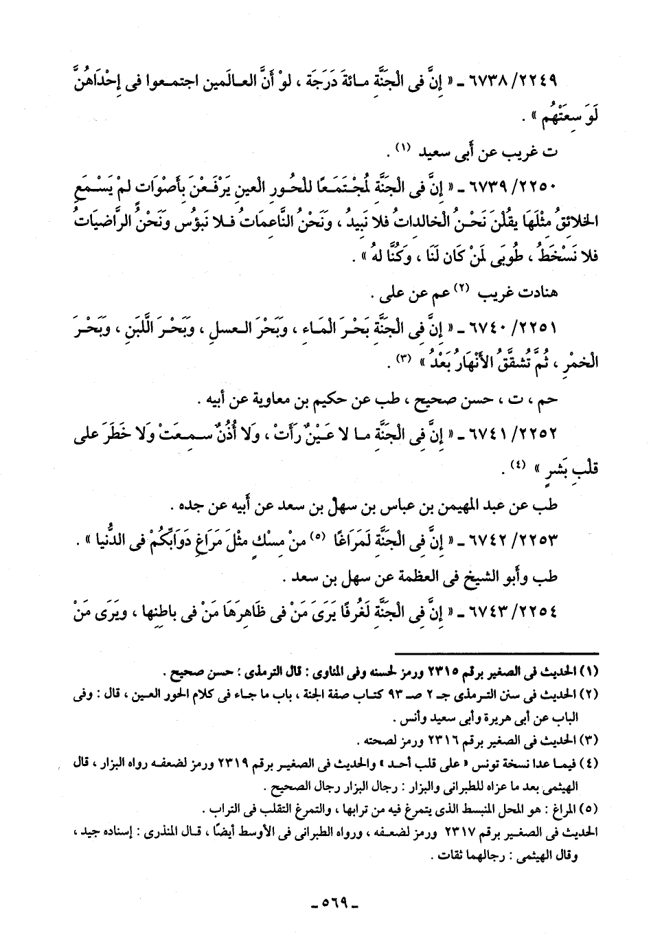 2250/ 6739 - "إِنَّ في الجَنَّةِ لمُجْتَمَعًا للحُورِ العينِ يَرْفَعْنَ بِأَصْوَات لمْ يَسْمَعِ الخلائقُ مِثْلَهَا يقُلنَ نَحْنُ الخالدِاتُ فلا نَبِيدُ، وَنَحْنُ النَّاعِمَاتُ فلا نَبؤُس وَنَحْنُ الرَّاضيَاتُ فلا نَسْخَطُ، طُوبَى لمَنْ كان لَنَا، وَكُنا لهُ".