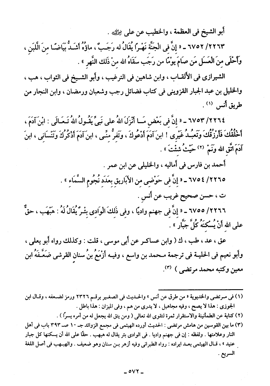 2263/ 6752 - "إِنَّ فِى الجَنَّةِ نَهْرًا يُقَالُ له رَجَبٌ، ماؤُهُ أشَدُّ بَيَاضًا مِنَ الَّلبَنِ، وَأَحْلَى مِنَ العَسَل مَن صَامَ يوْمًا من رَجَب سَقَاهُ اللَّه مِنْ ذَلك النَّهرِ".