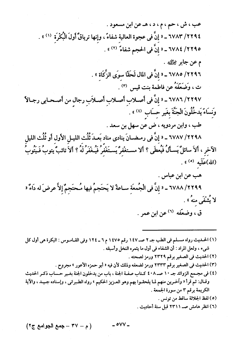 2299/ 6788 - "إِنَّ في الجُمعَةِ ساعةً لا يَحتَجمُ فيها مُحتَجِمٌ إِلا عرضَ له دَاءٌ" لا يُشْفَى مِنهُ".