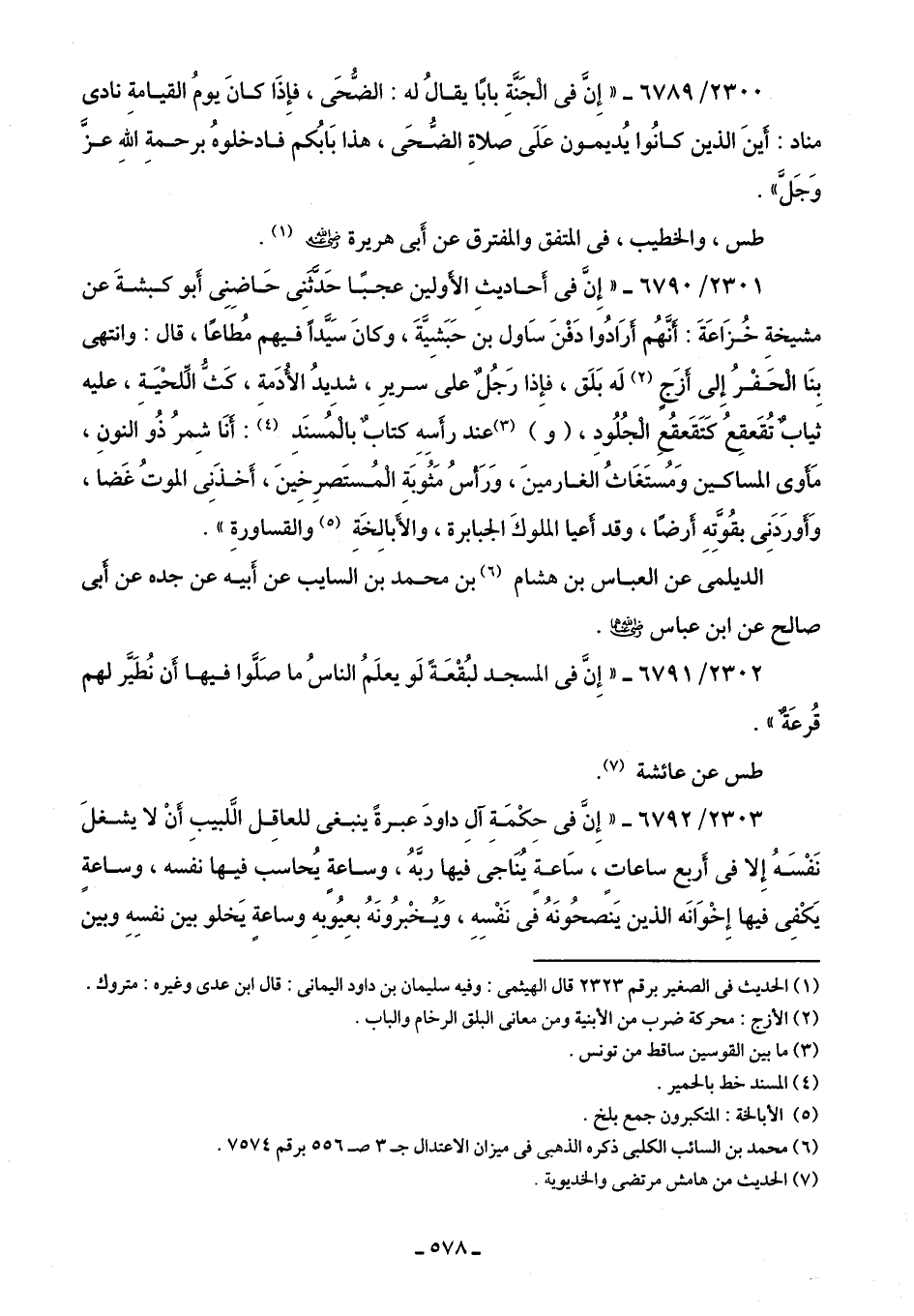 2300/ 6789 - "إِنَّ في الجَنَّةِ بابًا يقالُ له: الضُّحَى، فإِذَا كان يومُ القيامةِ نادى مناد: أينَ الذين كانُوا يُديمون عَلَى صلاةِ الضُّحَى، هذا بَابُكم فادخلوهُ برحمةِ اللَّهِ عزَّ وَجَلَّ".