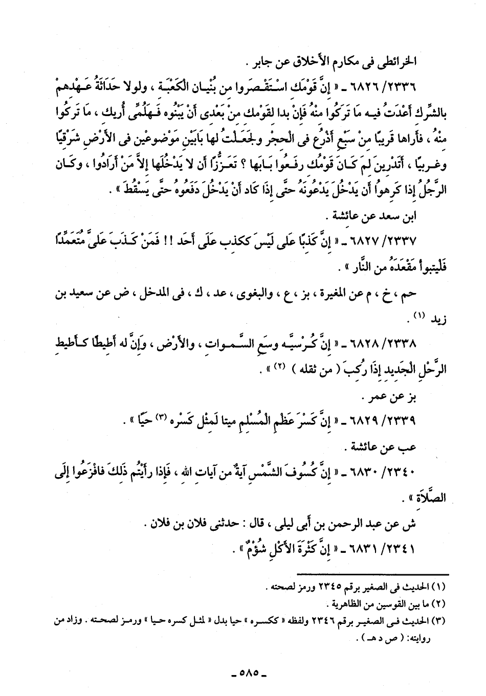 2338/ 6828 - "إِنَّ كُرْسيَّه وسَعِ السَّمواتِ، والأَرْض، وَإِنَّ له أَطِيطًا كأَطيطِ الرَّحْلِ الجَدِيدِ إِذَا رُكِبَ (من ثقله) (¬2) ".