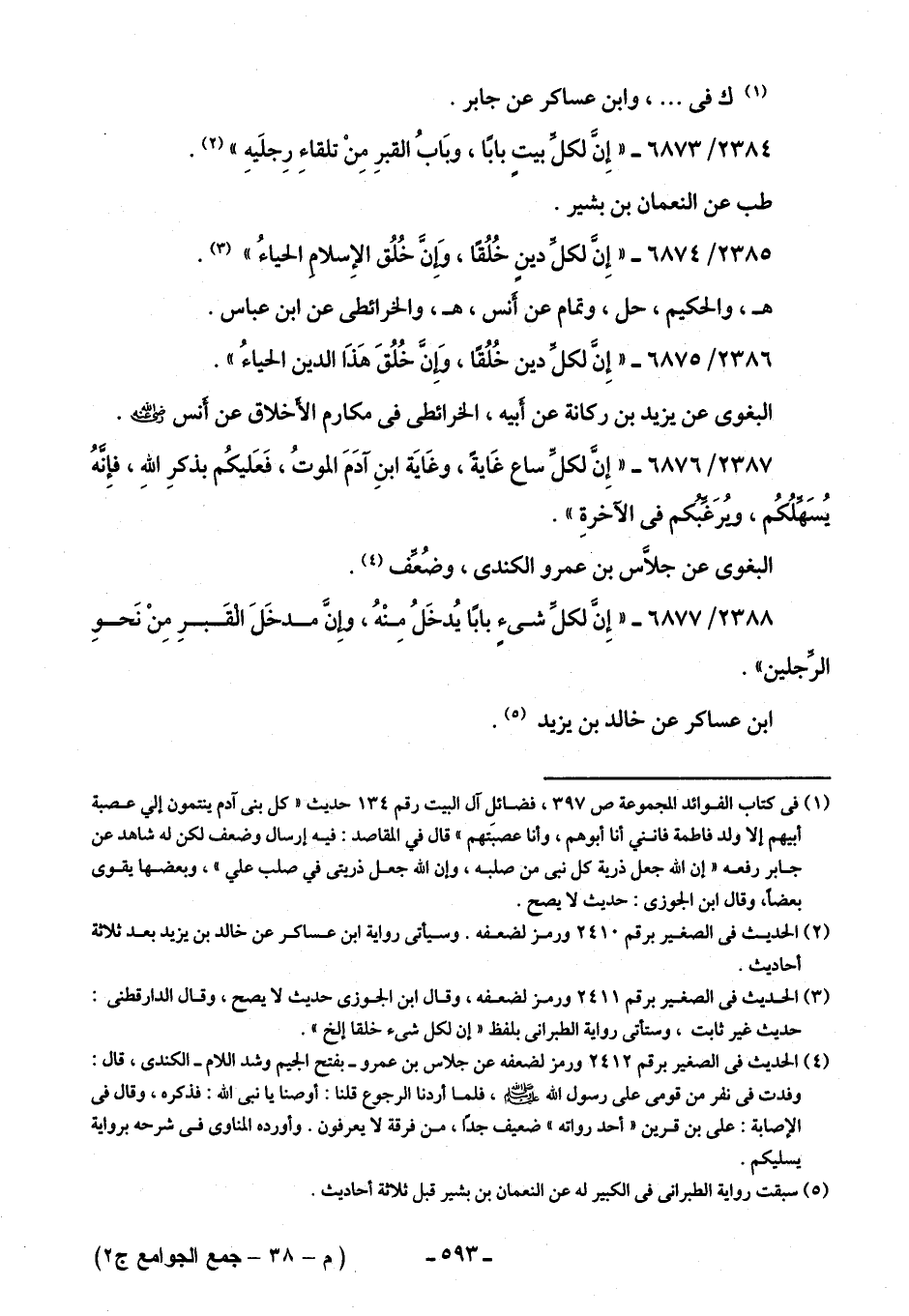 (¬3) الحديث في الصغير برقم 2411 ورمز لضعفه، وقال ابن الجوزى حديث لا يصح، وقال الدارقطنى: حديث غير ثابت، وصتاتى رواية الطبرانى بلفظ "إن لكل شئ خلقا إلخ".