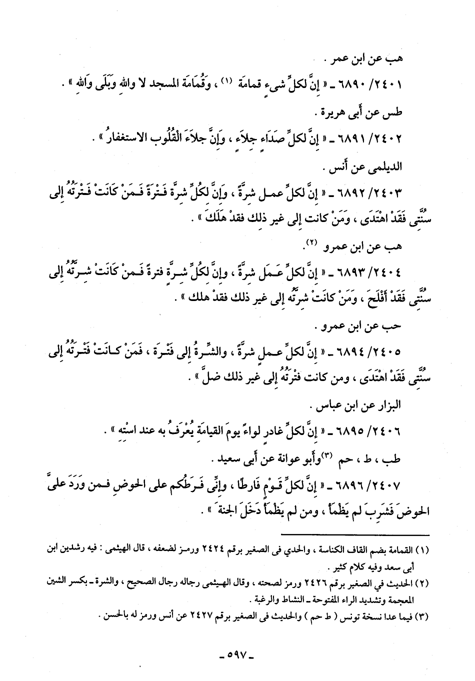 2403/ 6892 - "إِنَّ لكلِّ عمل شِرَّةً، وَإِنَّ لِكُلِّ شِرَّة فَتْرَةً فَمَنْ كَانَتْ فَتْرَتُهُ إِلى سُنَّتِى فَقَدْ اهْتَدَى، وَمَنْ كانت إِلى غير ذلِك فقدْ هَلَكَ".