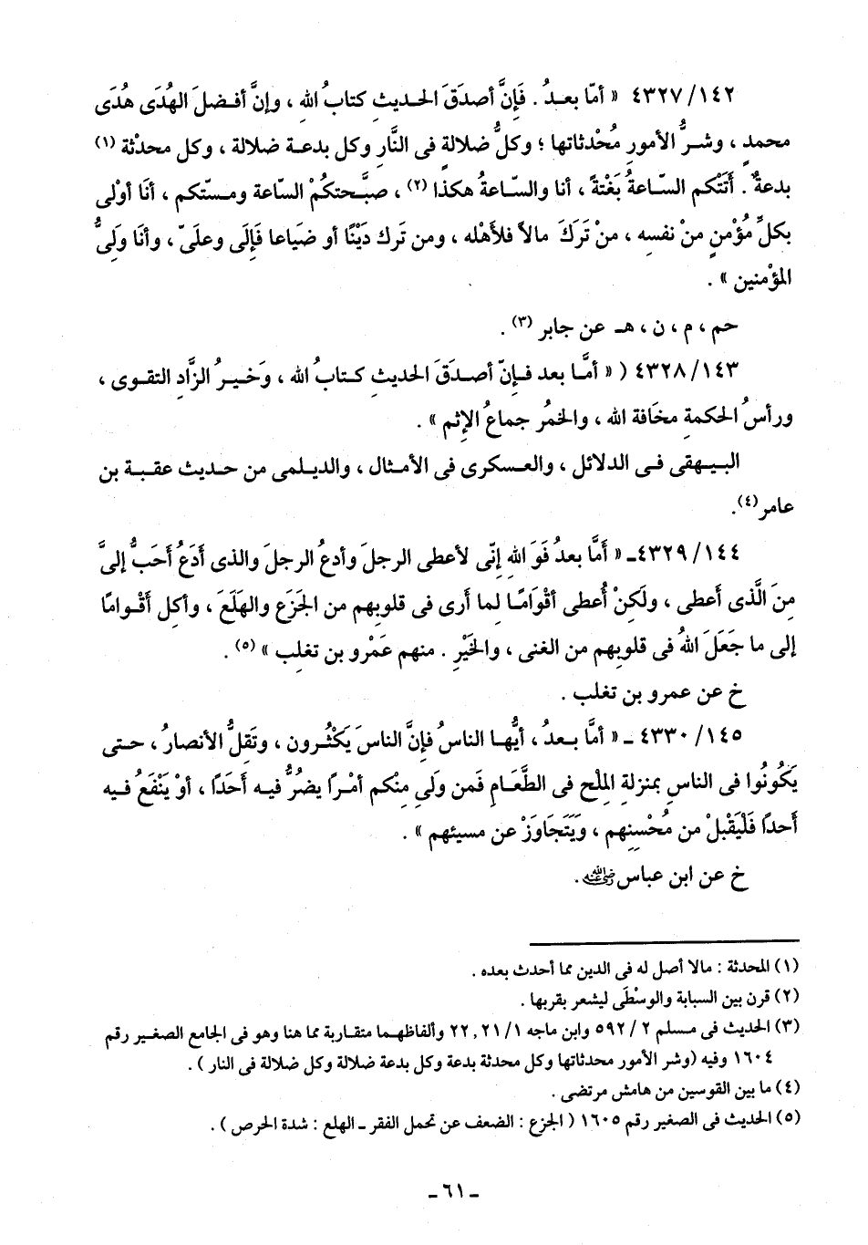 143/ 4328 ("أما بعد فإِن أصدَقَ الحديثِ كتابُ الله، وَخيرُ الزادِ التقوى، ورأسُ الحكمةِ مخَافة الله، والخمرُ جماعُ الإِثم".