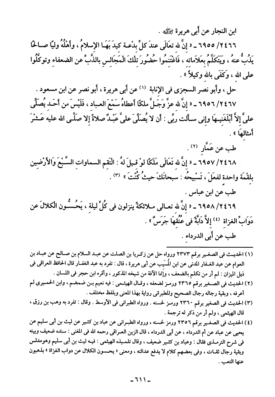 2469/ 6958 - "إِنَّ للَّهِ تعالى ملائكةً ينزلون في كُلِّ ليلةِ، يَحُسُّون الْكلالَ عن دَوَابِّ الغزاةِ (¬4) إِلَّا دَابَّةً في عُنُقِهَا جَرَسٌ".