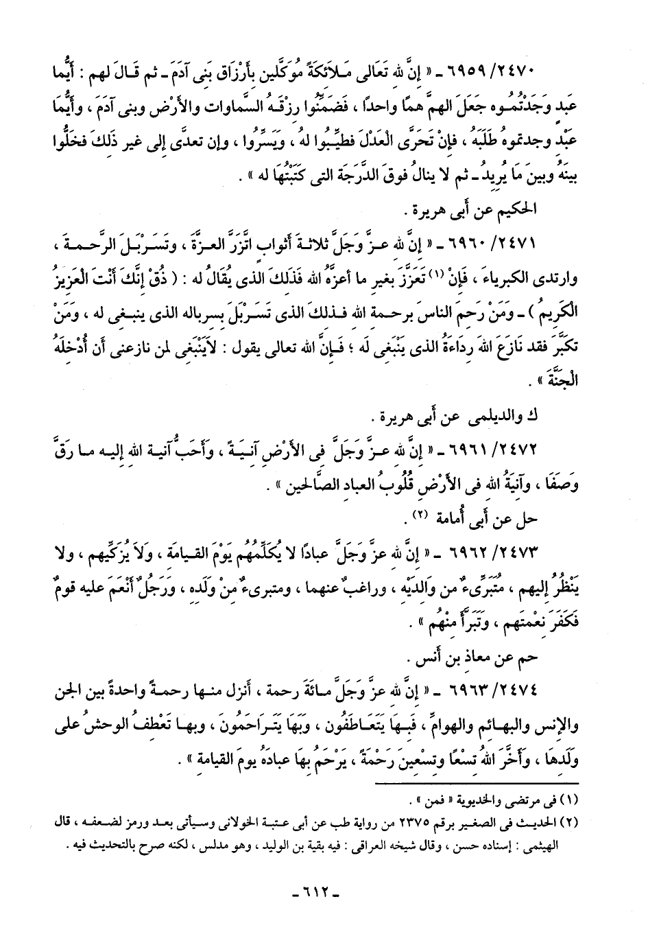 2474/ 6963 - "إِنَّ للَّهِ عَزَّ وَجَلَّ مائَةَ رحمة، أَنزل منها رحمةً واحدةً بين الجن والإِنس والبهائِم والهوامِّ، فَبِهَا يَتَعَاطَفُون، وَبَهَا يَتَرَاحَمُونَ، وبها تَعْطِفُ الوحشُ على وَلَدِهَا، وَأَخَّرَ اللَّهُ تِسْعًا وتِسْعِينَ رَحْمَةً، يَرْحَمُ بِهَا عبادَهُ يومَ القيامةِ".