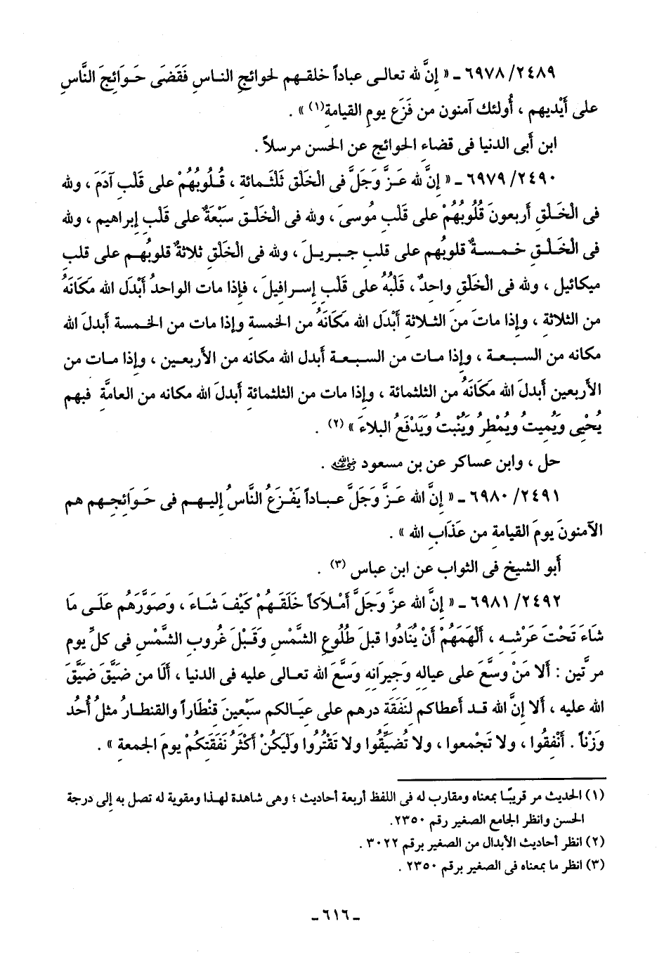 2489/ 6978 - "إِنَّ للَّه تعالى عبادًا خلقهم لحوائج الناسِ فَقَضَى حَوَائِجَ النَّاسِ على أيْديهم، أولئك آمنون من فَزعَ يومِ القيامةِ (¬1) ".