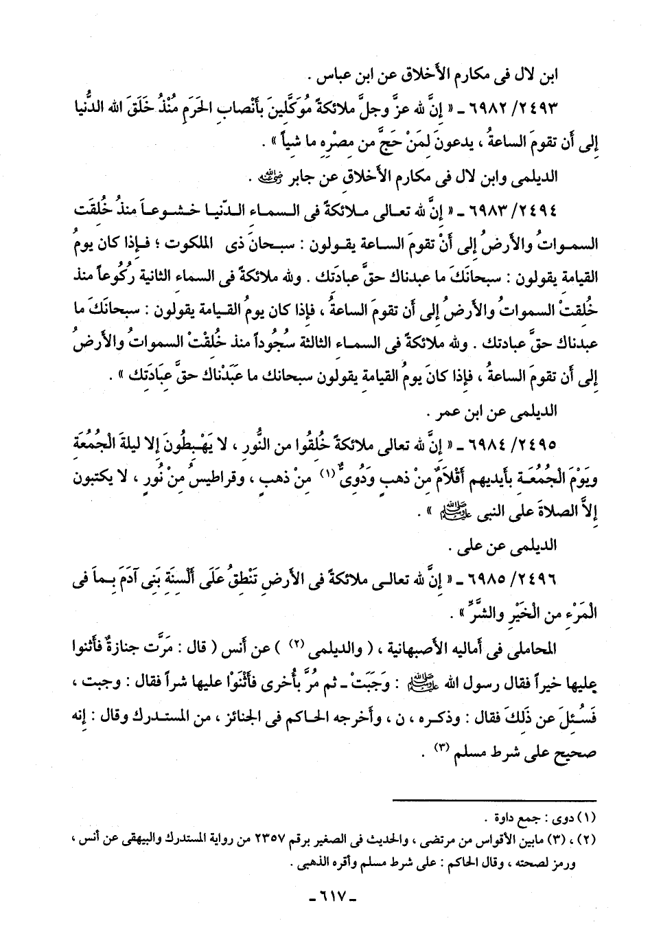 2495/ 6984 - "إِنَّ للَّهِ تعالى ملائكةً خُلِقُوا من النُّورِ، لا يَهْبِطُونَ إِلا ليلةَ الْجُمُعَةِ ويَوْمَ الجُمُعَة بأَيديهم أقْلَامٌ مِنْ ذهبٍ وَدُوِىٌّ (¬1) مِنْ ذهبٍ، وقراطيسُ مِنْ نُورٍ، لا يكتبون إِلَّا الصلاةَ على النبى -صلى اللَّه عليه وسلم-".