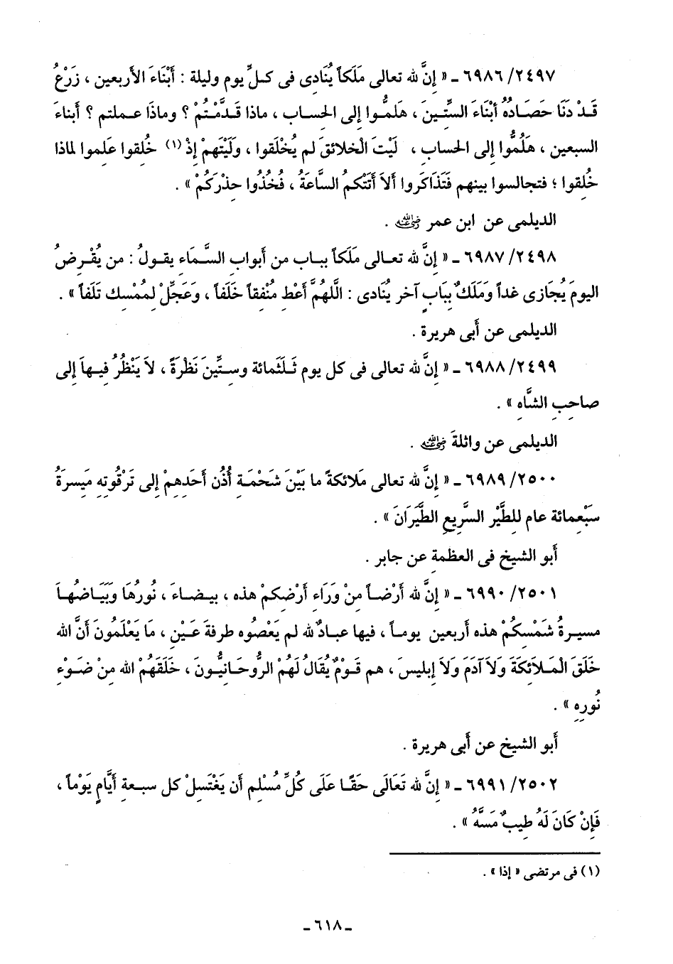 2500/ 6989 - "إِنَّ للَّه تعالى مَلائكةً ما بَيْنَ شَحْمَةِ أُذُن أحَدِهِمْ إِلى تَرْقُوتِهِ مَيِسرَةُ سَبْعِمائة عام للِطيْر السَّرِيعِ الطَّيرَانَ".