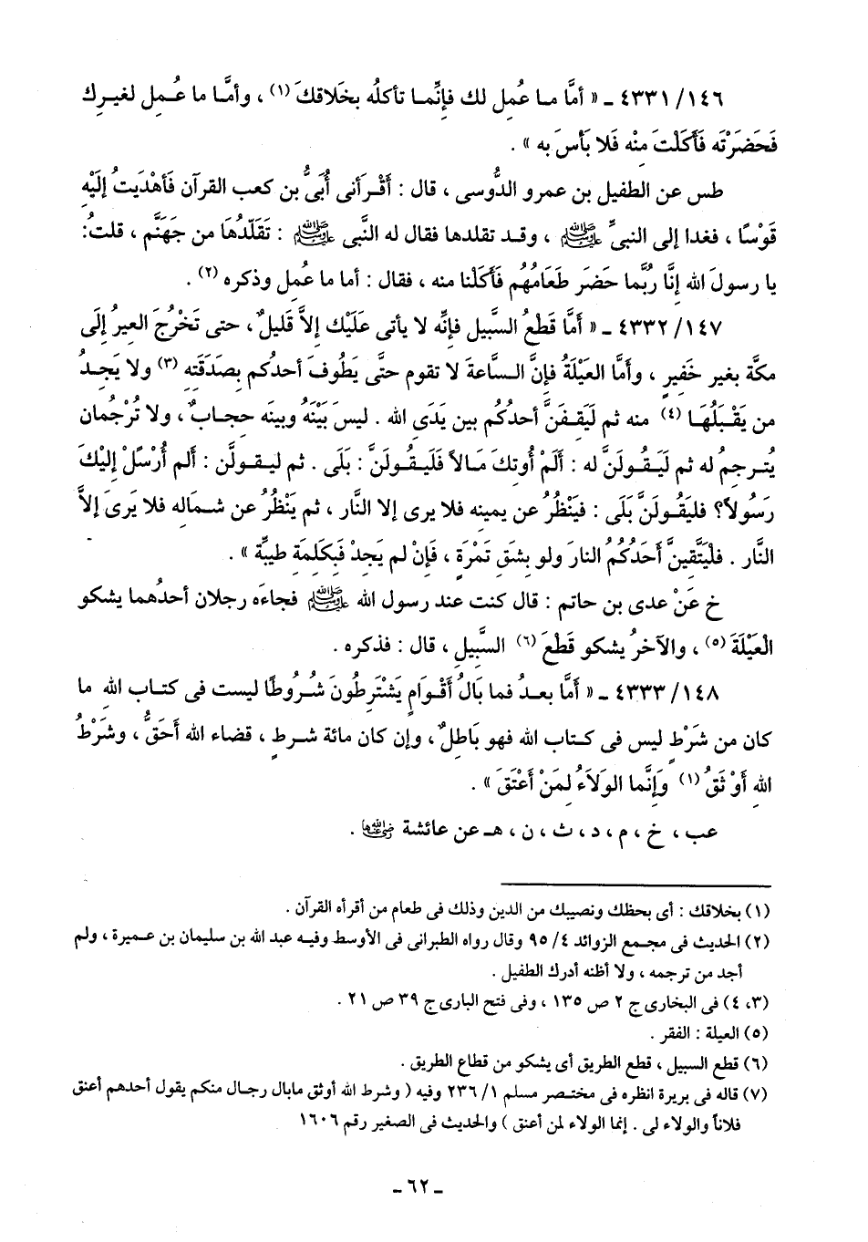 147/ 4332 - "أما قطعُ السَّبيل فإِنَّه لا يأتي عَلَيك إلا قَليلٌ، حتى تَخْرُجَ العِيرُ إِلَى مكَّة بغير خَفيرٍ، وأمَّا العَيلَةُ فإن السَّاعةَ لا تقوم حتَّى يَطُوفَ أحدُكم بِصَدَقَتِهِ (¬3) ولا يَجِدُ من يَقْبَلُهَا (¬4) منه ثم لَيَقِفَنَّ أحدُكُم بين يَدَيِ الله. ليسَ بَينَهُ وبينَه حِجابٌ، ولا تُرْجُمان يُترجمُ له ثم لَيَقُولَنَّ له: أَلَمْ أوتِكَ مَالًا فَلَيقُولَنَّ: بَلَى. ثم ليقولَّن: ألم أُرْسَلْ إِليكَ رَسُولًا؟ فليَقُولَنَّ بَلَى: فيَنْظُرُ عن يمينِه فلا يرى إلا النَّار، ثم يَنْظُرُ عن شمَالِه فلا يَرى إلَّا النار. فليَتَّقِينَّ أحَدُكُمُ النارَ ولو بِشَقِّ تَمْرَةٍ، فَإِنْ لم يَجِدْ فَبكَلمَةِ طيِّبة".