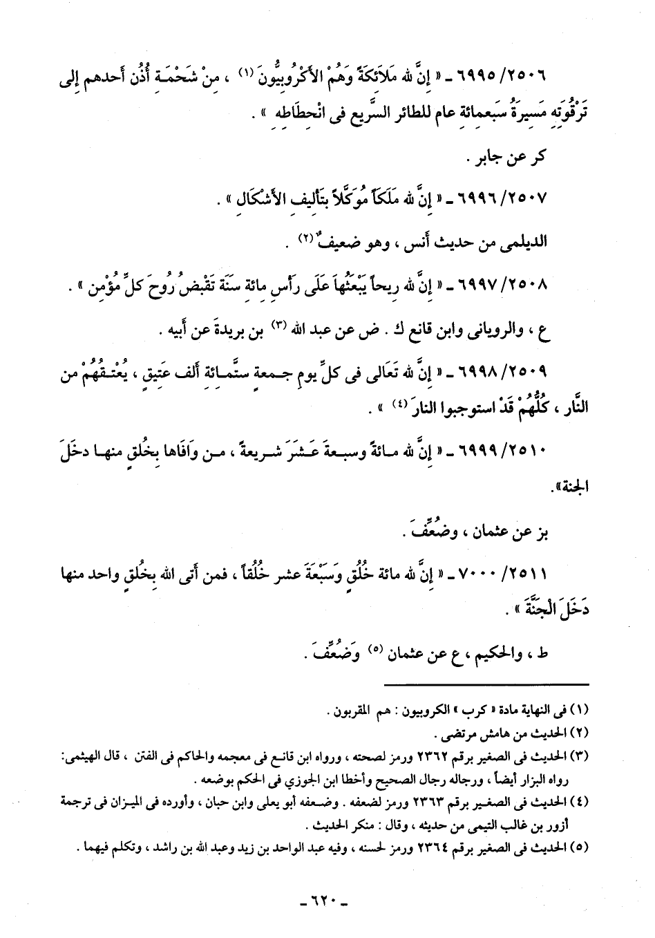 2506/ 6995 - "إِنَّ للَّه مَلَائكَةً وَهُمْ الأَكْرُوبِيُّونَ (¬1)، مِن شَحْمَةِ أُذُن أَحدهم إِلى تَرْقُوَتِهِ مَسِيرَةُ سَبعمِائةِ عام للطائر السَّريع في انْحِطَاطِهِ".