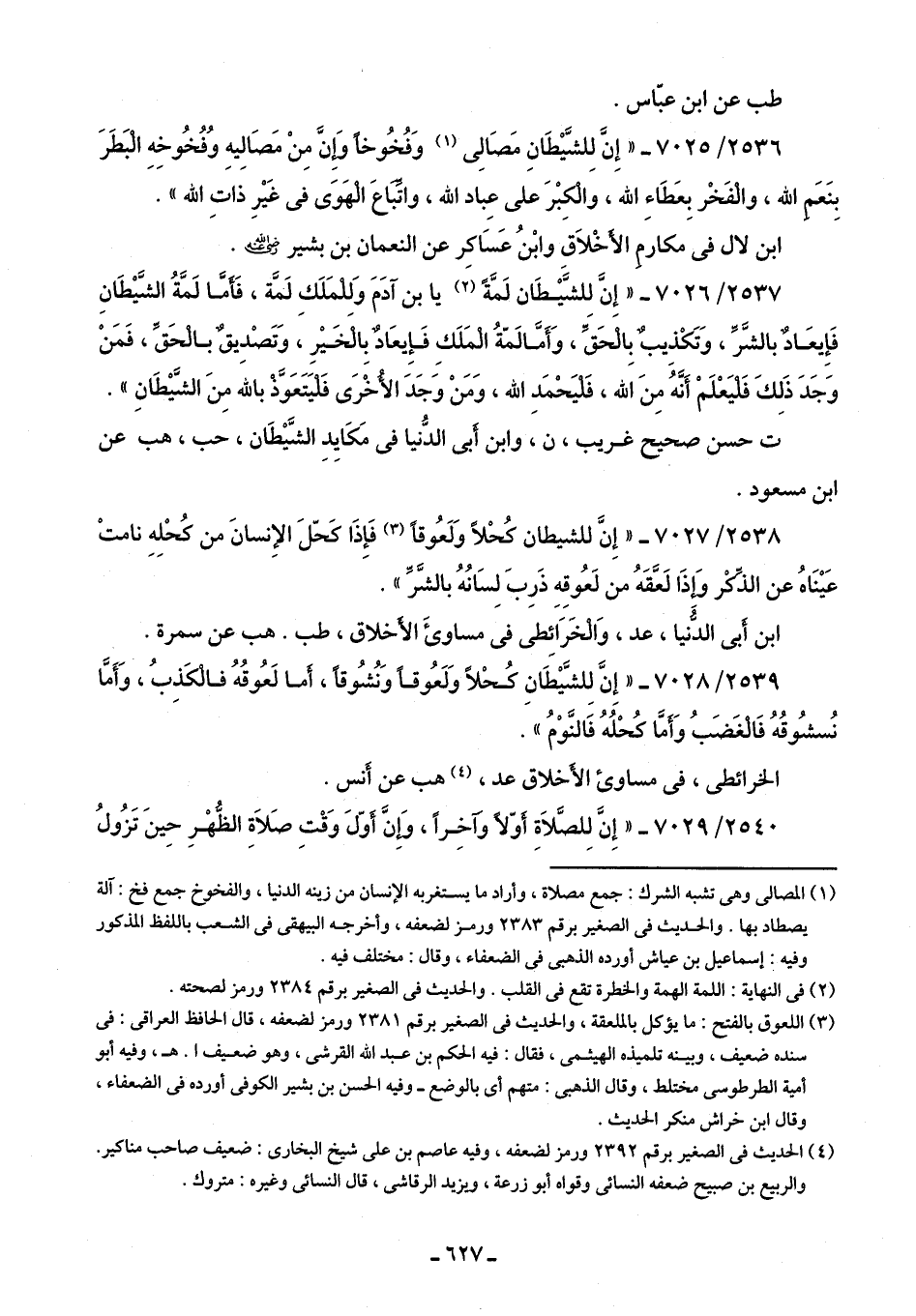 2536/ 7025 - "إِنَّ لِلشَّيْطَانِ مَصَالِى (¬1) وَفُخُوخًا وَإِنَّ مِنْ مَصَالِيهِ وفُخُوخِهِ الْبَطَرَ بِنَعَمِ اللَّه، والْفَخْر بِعَطَاءِ اللَّه، والْكِبْرَ على عِباد اللَّه، واتِّباعَ الْهَوَى في غَيْرِ ذاتِ اللَّه".