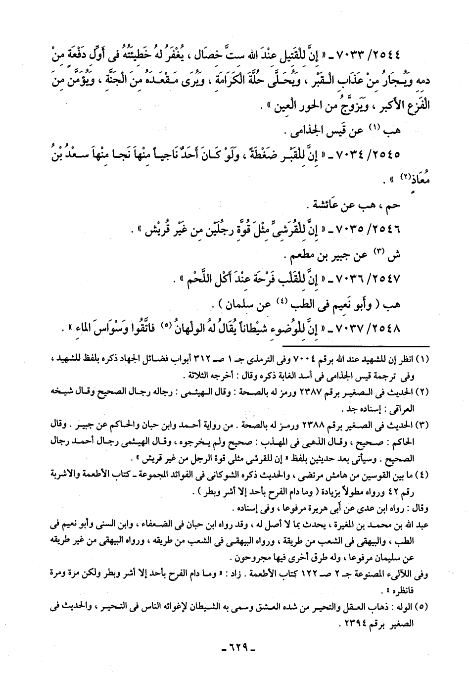 (¬1) انظر إن للشهيد عند اللَّه برقم 7004 وفى الترمذى جـ 1 صـ 312 أبواب فضائل الجهاد ذكره بلفظ للشهيد، وفى ترجمة قيس الجذامى في أسد الغابة ذكره وقال: أخرجه الثلاثة.
