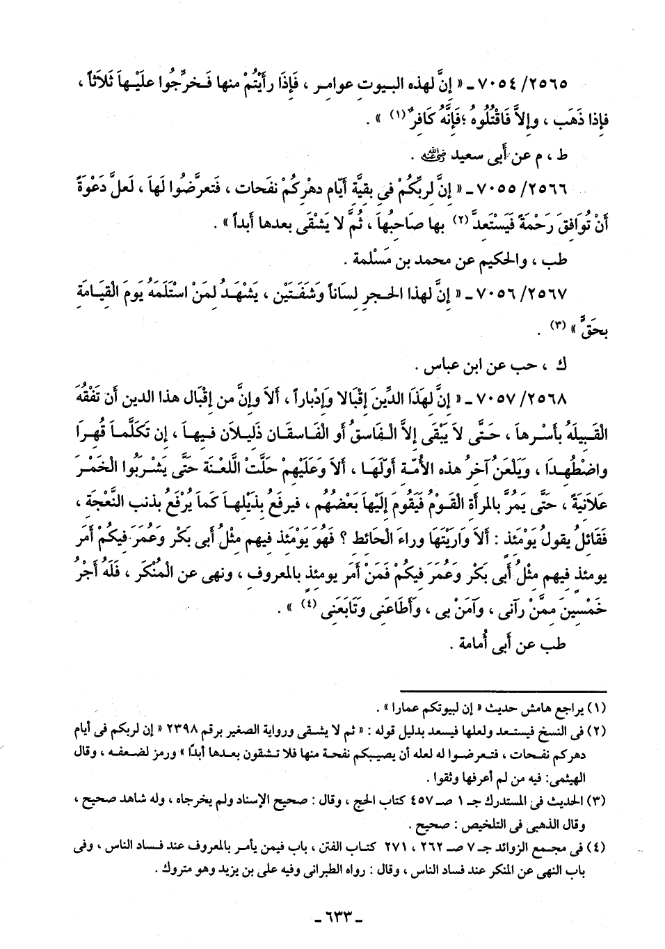 2568/ 7057 - "إِنَّ لِهَذَا الدِّينَ إِقْبَالا وَإدْبارًا، أَلَا وَإِنَّ من إِقْبَال هذا الدين أَن تَفْقُهَ الْقَبِيلَهُ بأَسْرها، حَتَّى لَا يَبْقَى إِلَّا الْفَاسقُ أَو الْفَاسقَان ذَلِيلَان فيِها، إِن تَكَلَّما قُهِرَا واضْطُهِدَا، وَيَلْعَنُ آخِرُ هذه الأُمّةِ أَوّلَهَا، أَلَا وَعَلَيْهِمْ حَلَّتْ الَّلعْنَة حَتَّى يَشْرَبُوا الْخَمْرَ عَلَانِيَةً، حَتَّى يَمُرَّ بالمرأَةِ الْقَوْمُ فَيَقُومَ إِلَيْها بَعْضُهُم، فيرفَعُ بِذَيْلِها كَمَا يُرْفَعُ بذنب النَّعْجَةِ، فَقَائِلُ يقولُ يَوْمَئِذٍ: أَلَا وَارَيْتَهَا وراءَ الْحَائِط؟ فَهُوَ يَوْمَئِذ فِيهم مِثْلُ أَبى بَكْر وَعُمَرَ فِيكُمْ أَمَر يومئذٍ فِيهم مِثْلُ أَبى بَكْر وَعُمَرَ فِيكُمْ فَمَنْ أَمَر يومئِذٍ بالمعروفِ، ونهى عن الْمُنْكَر، فَلَهُ أَجْرُ خَمْسِينَ مِمَّنْ رآنى، وَآمَنْ بى، وَأَطَاعَنِى وَتَابَعَنِى (¬4) ".