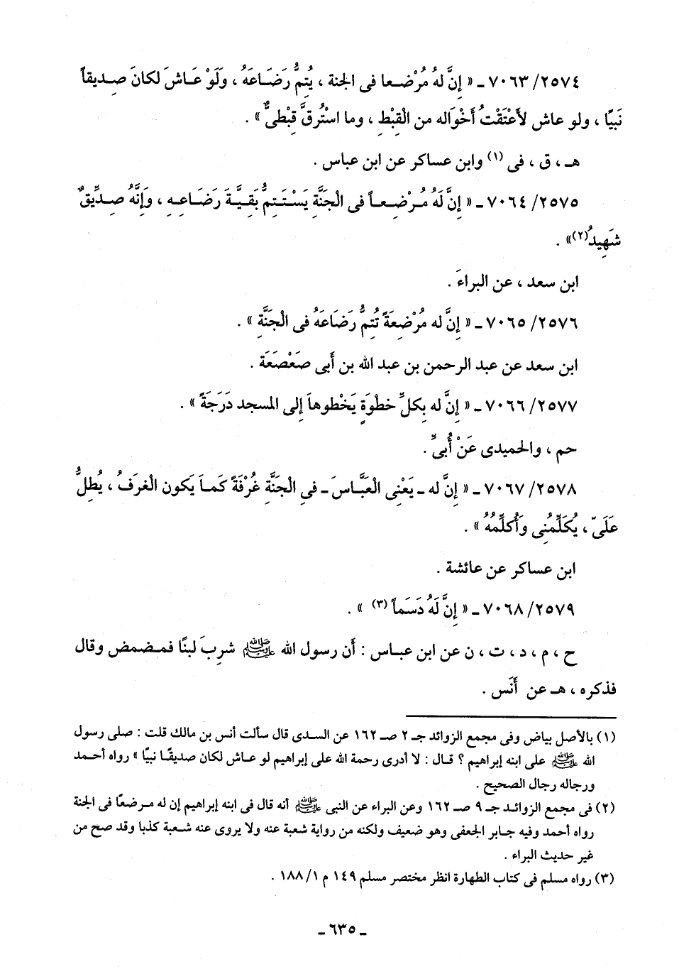 2574/ 7063 - "إِنَّ لهُ مُرْضعا في الجنة، يُتِمُّ رَضَاعَهُ، وَلَوْ عَاشَ لكانَ صِديقًا نَبيًّا، ولو عاش لأَعْتَقْتُ أَخْوَاله من الْقِبْطِ، وما اسْتُرقَّ قِبْطىٌّ".