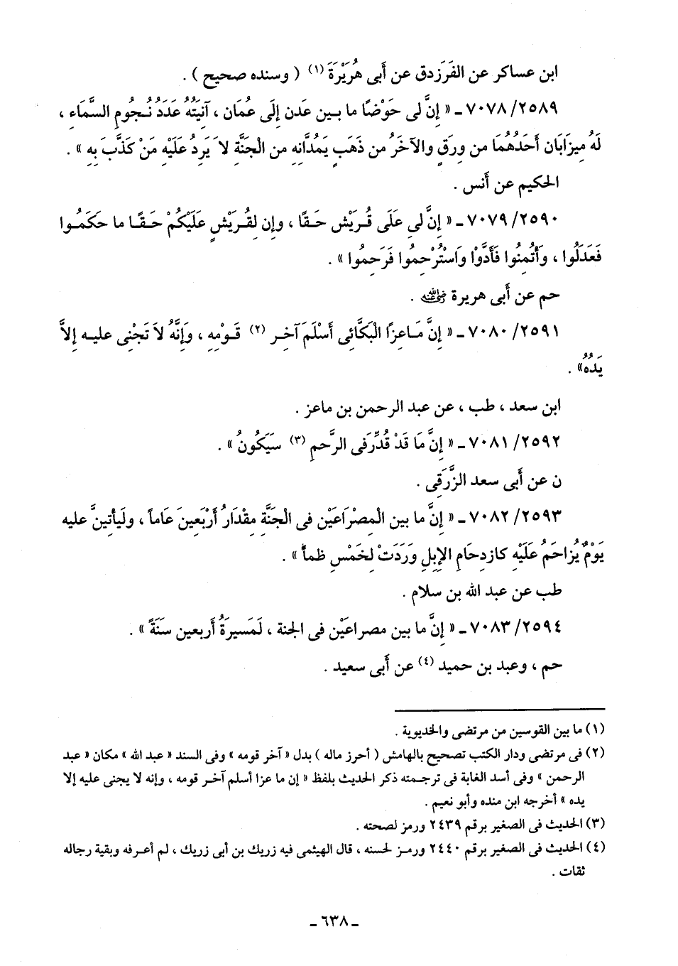 2589/ 7078 - "إِنَّ لى حَوْضًا ما بين عَدن إِلَى عُمَان، آنِيَتُهُ عَدَدُ نُجُومِ السَّمَاءِ، لَهُ مِيزَابَان أَحَدُهُمَا من وِرَقٍ والآخَرُ من ذَهَبٍ يَمُدَّانِهِ من الْجَنَّةِ لَا يَرِدُ عَلَيْهِ مَنْ كَذَّبَ بِهِ".