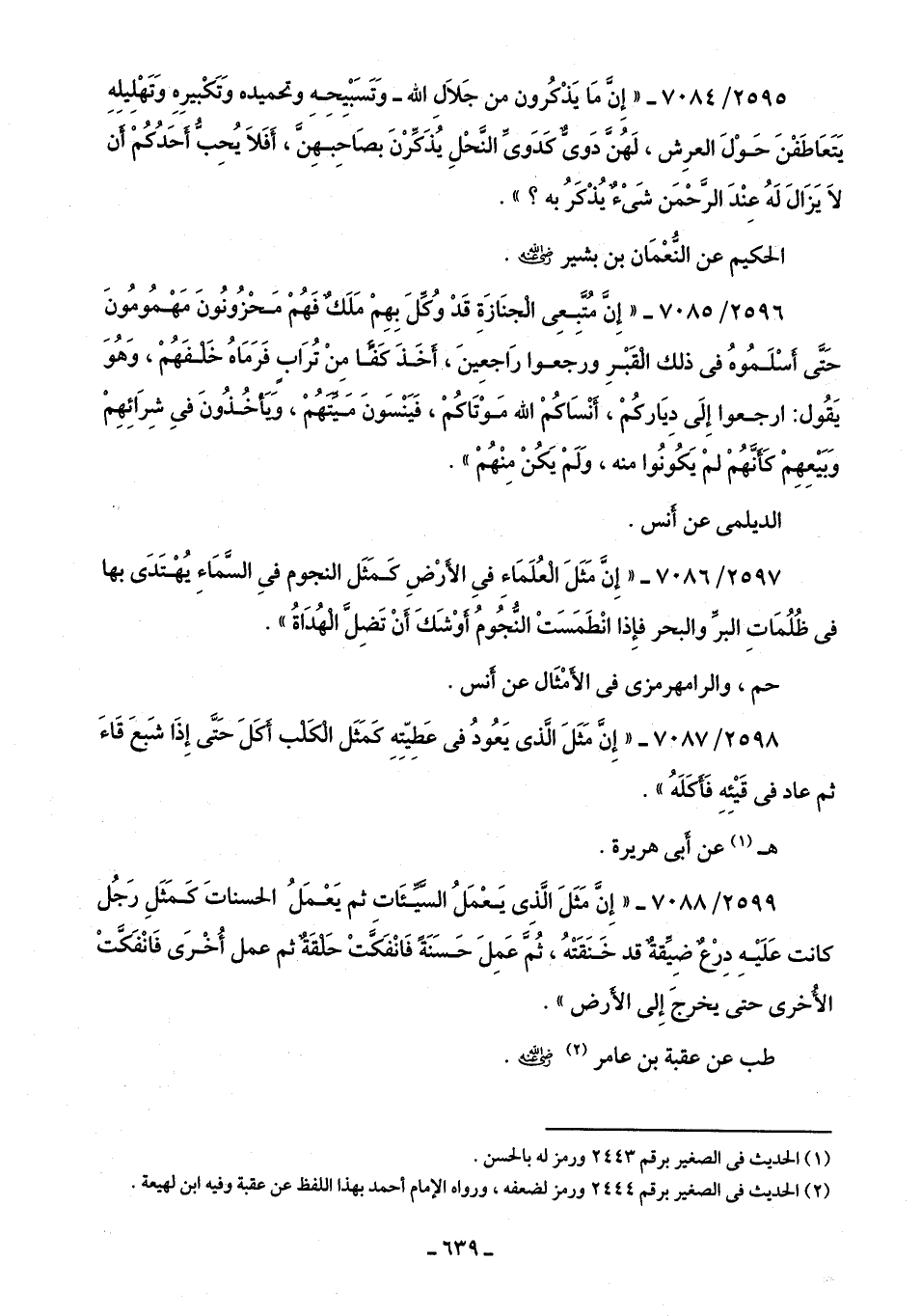 2597/ 7086 - "إِنَّ مَثَلَ الْعُلَمَاءِ فِى الأَرْضِ كَمَثَل النجوم فِى السَّمَاءِ يُهْتَدَى بها في ظُلُمَاتِ البرِّ والبحر فإِذا انْطَمَسَتْ النُّجُومُ أَوْشَكَ أَنْ تَضِلَّ الْهُدَاةُ".