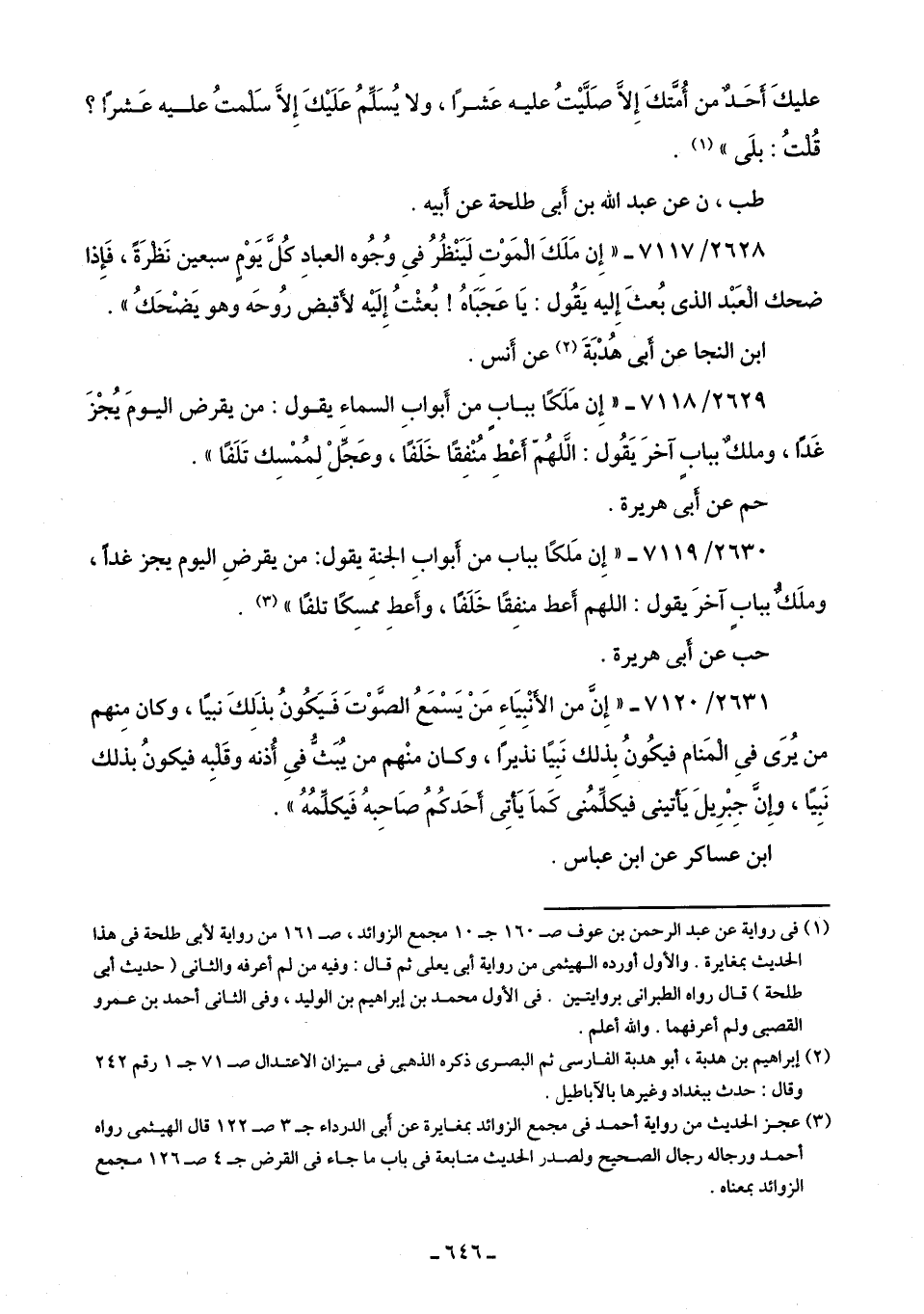 (¬1) في رواية عن عبد الرحمن بن عوف صـ 160 جـ 10 مجمع الزوائد، صـ 161 من رواية لأبى طلحة في هذا الحديث بمغايرة. والأول أورده الهيثمى من رواية أَبى يعلى ثم قال: وفيه من لم أعرفه والثانى (حديث أبى طلحة) قال رواه الطبرانى بروايتين. في الأول محمد بن إبراهيم بن الوليد، وفى الثانى أحمد بن عمرو القصبى ولم أعرفهما. واللَّه أعلم.