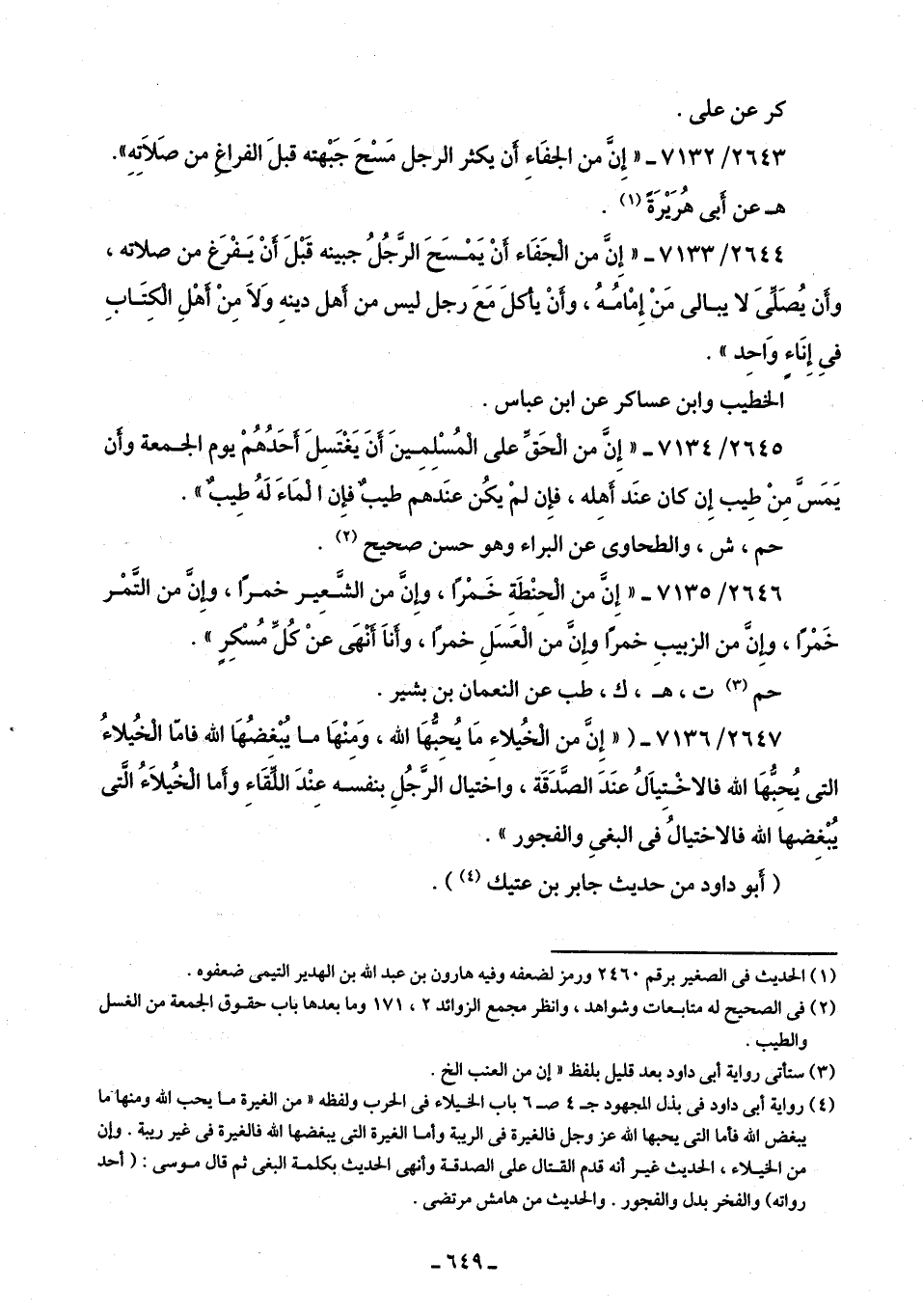 2644/ 7133 - "إِنَّ من الْجَفَاء أَنْ يَمْسَحَ الرَّجُلُ جبينه قَبْلَ أَنْ يَفْرغَ من صلاته، وأَن يُصَلِّى لا يبالى مَنْ إِمْامُهُ، وأَنْ يأكلَ مَعَ رجل ليس من أَهل دينهِ وَلَا مِنْ أهْلِ الْكِتَابِ فِى إِنَاءٍ وَاحِدٍ".
