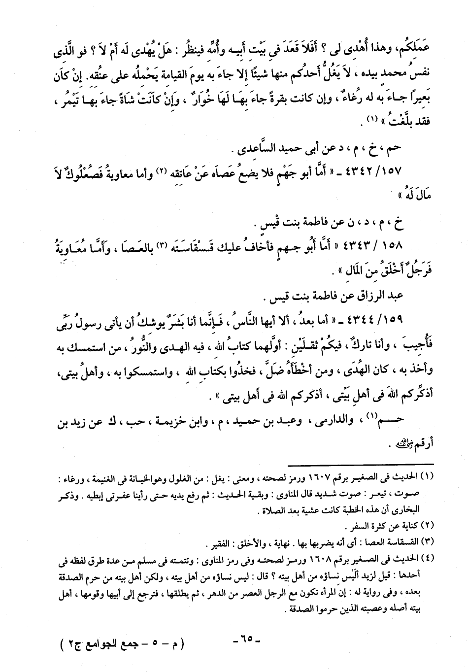 (¬4) الحديث في الصغير برقم 1608 ورمز لصحته وفي رمز المناوى: وتتمته في مسلم من عدة طرق لفظه في أحدها: قيل لزيد ألَيس نساؤه من أهل بيته؟ قال: ليس نساؤه من أهل بيته، ولكن أهل بيته من حرم الصدقة بعده، وفي رواية له: إنَّ المرأه تكون مع الرجل العصر من الدهر، ثم يطلقها، فترجع إلى أبيها وقومها، أهل بيته أصله وعصبته الذين حرموا الصدقة.