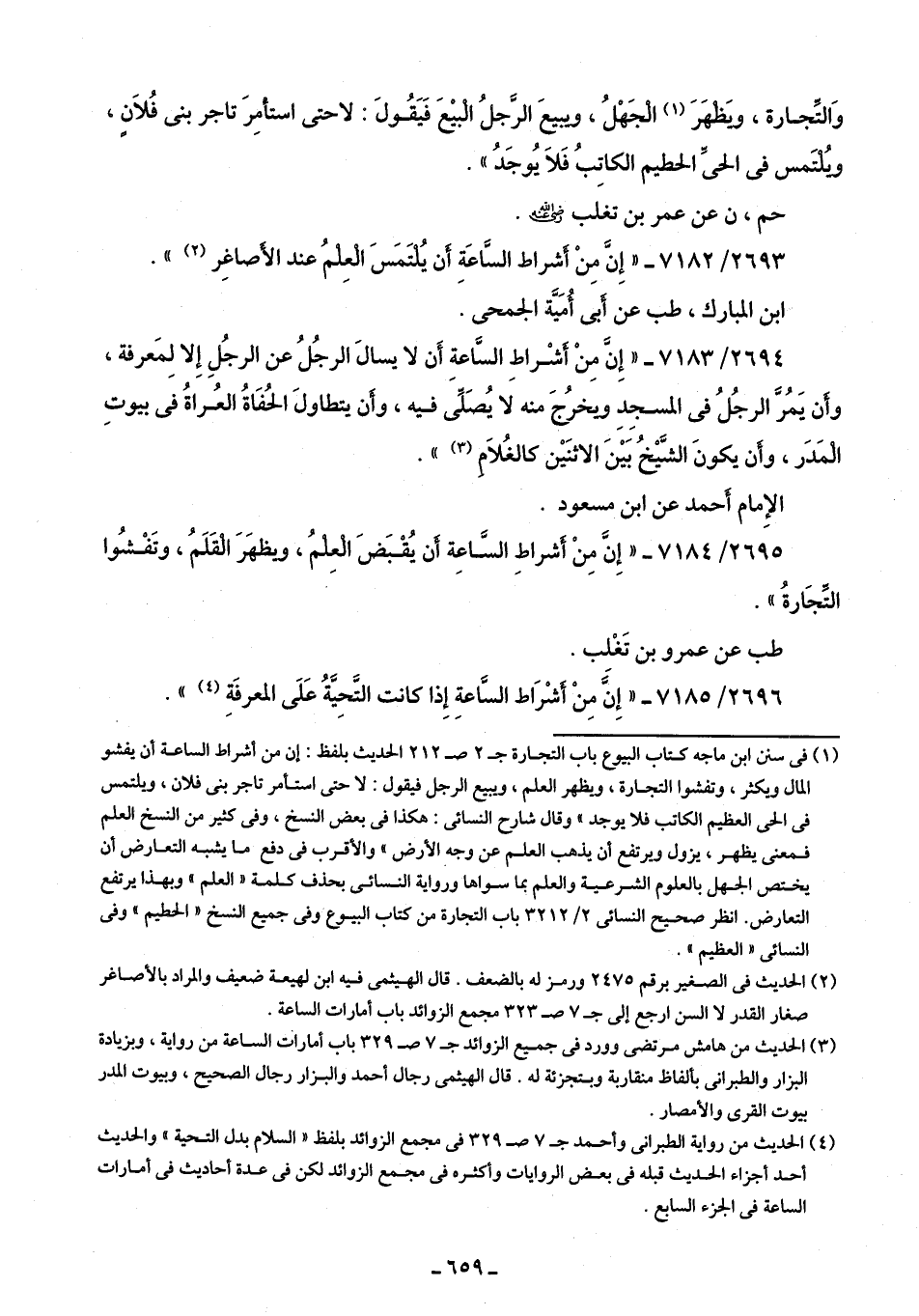 2694/ 7183 - "إِنَّ مِنْ أَشْراطِ السَّاعةِ أَن لا يسألَ الرجُلُ عن الرجُلِ إِلا لِمَعرفة، وأَن يَمُرَّ الرجُلُ في المسجِدِ ويخرُجَ منه لا يُصَلِّى فيه، وأَن يتطاولَ الحُفَاةُ العُراةُ في بيوتِ الْمَدَر، وأَن يكونَ الشَّيْخُ بَيْنَ الاثنَيْن كالغُلَامِ (¬3) ".