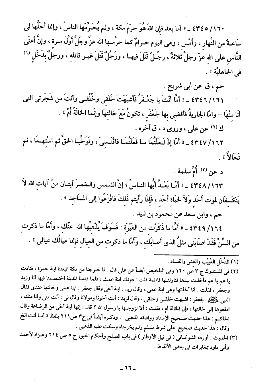 161/ 4346 - "أمَّا أنْتَ يا جَعْفَرُ فَأشبَهْتَ خَلقِى وخُلُقى وأنتَ من شَجَرتى التي أنَا مِنْهَا- وأما الجاريةُ فأقضِى بِها لجَعْفَر، تكونُ مَعَ خالتِهَا وإنَّما الخالةُ أمٌ".