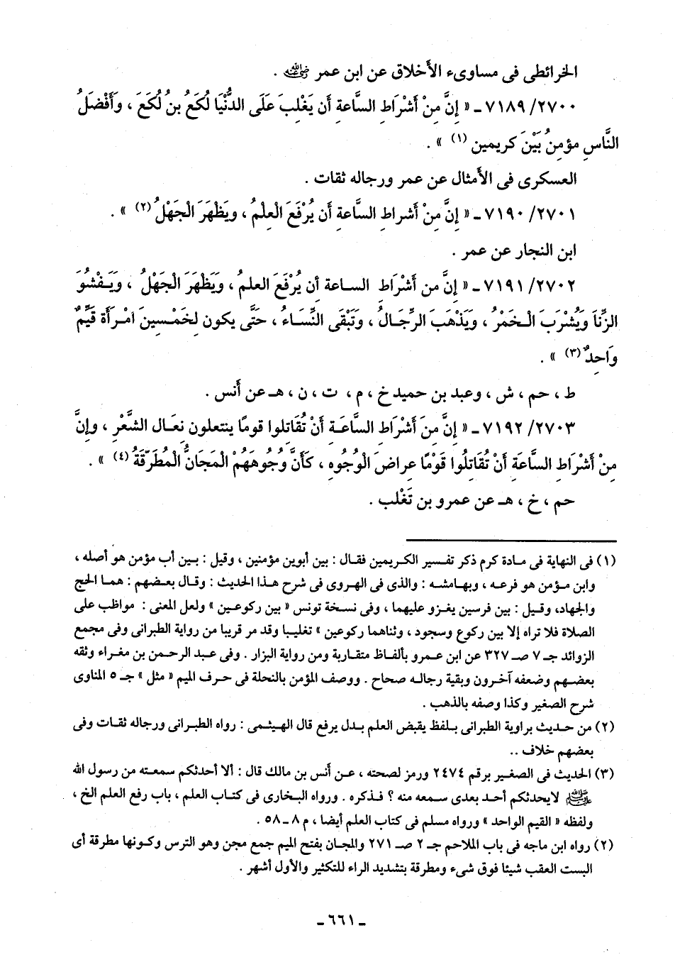 2701/ 7190 - "إِنَّ مِنْ أَشراطِ السَّاعةِ أَن يُرْفَعَ الْعِلْمُ، ويَظْهَرَ الْجَهْلُ (¬2) ".
