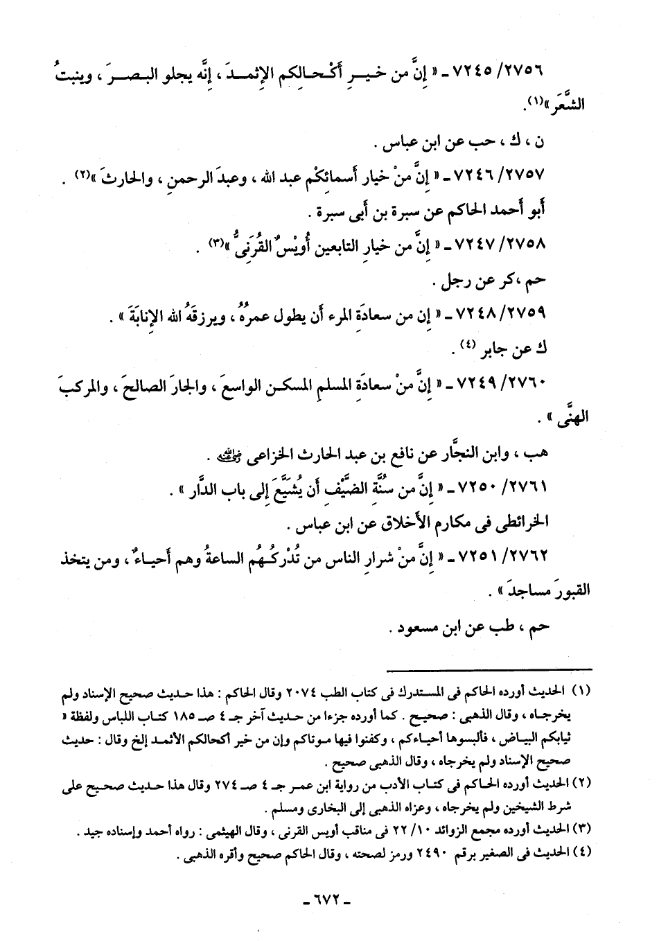 2757/ 7246 - "إِنَّ منْ خيار أَسمائِكْم عبد اللَّه، وعبدَ الرحمنِ، والحارثَ" (¬2).