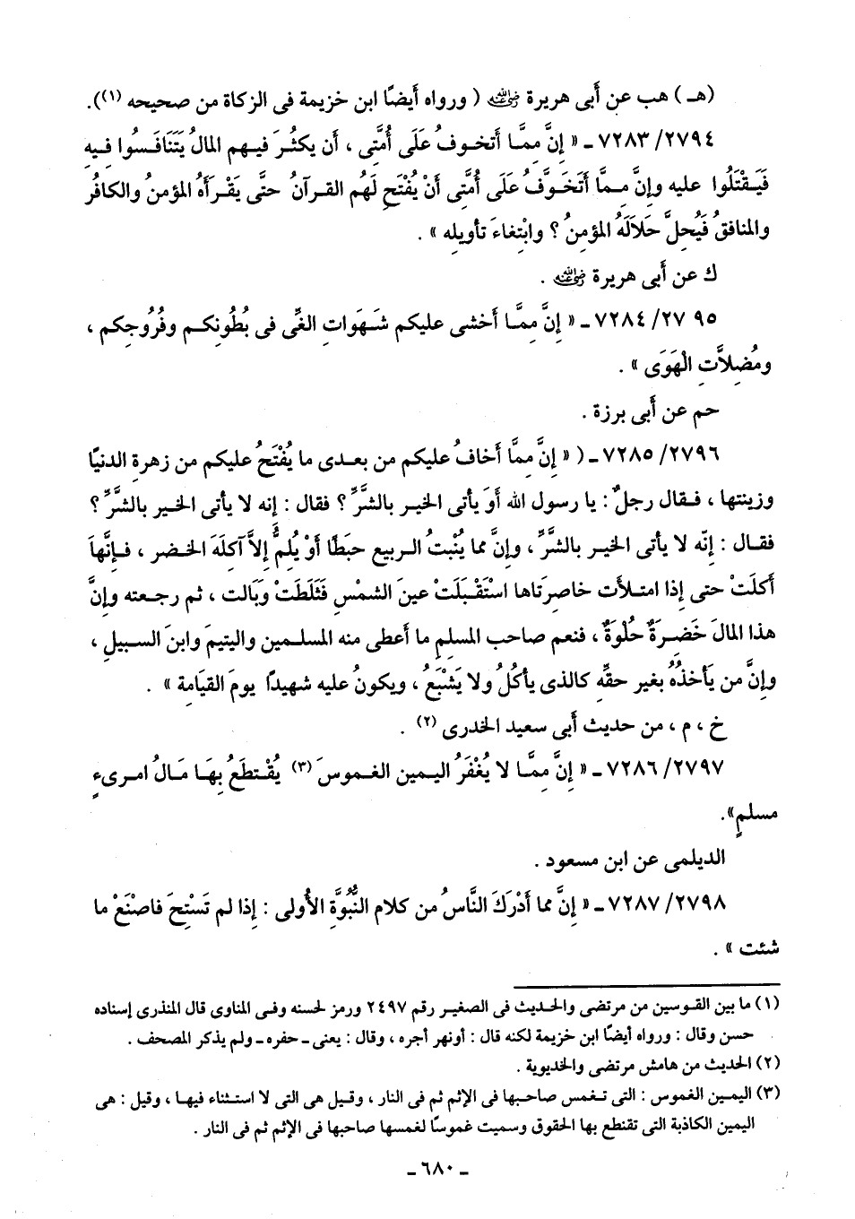 2796/ 7285 - ("إِنَّ مِمَّا أَخافُ عليكم من بعدى ما يُفْتَحُ عليكم من زهرةِ الدنيا وزينتها، فقال رجلٌ: يا رسول اللَّه أَوَ يأتى الخير بالشَّرِّ؟ فقال: إنه لا يأتى الخير بالشَّرِّ؟ فقال: إِنّه لا يأتى الخير بالشَّرِّ، وإِنَّ مما يُنْبتُ الربيع حبَطًا أَوْ يُلِمُّ إِلَّا آكِلَهَ الخضر، فإِنَّها أَكلَتْ حتى إِذا امتلأَت خاصِرَتاها اسْتَقْبَلَتْ عينَ الشمْسِ فَثَلَطَتْ وَبَالت، ثم رجعته وإِنَّ هذا المالَ خَضِرَةٌ حُلْوَةٌ، فنعم صاحب المسلِمِ ما أَعطى منه المسلمين واليتيمَ وابنَ السبيلِ، وإِنَّ من يَأخذُهُ بغير حقِّهِ كالذى يأكُلُ ولا يَشْبعُ، ويكونُ عليه شهيدًا يومَ القيَامِة".