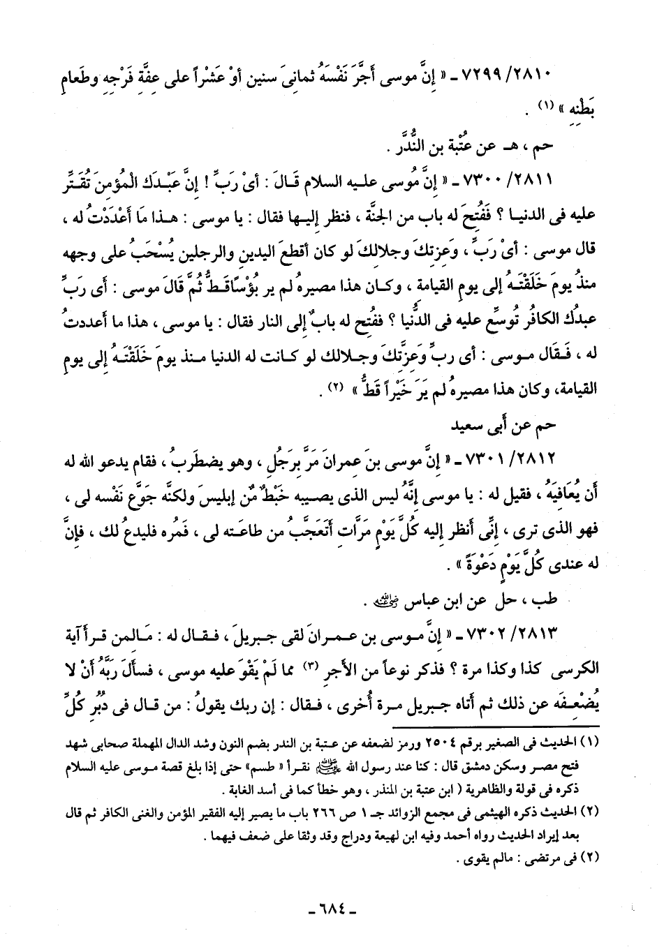 2810/ 7299 - "إِنَّ موسى أَجَّرَ نَفْسَهُ ثمانِى سنين أوْ عَشْرًا على عِفَّةِ فَرْجِهِ وطَعامِ بَطْنِهِ" (¬1).