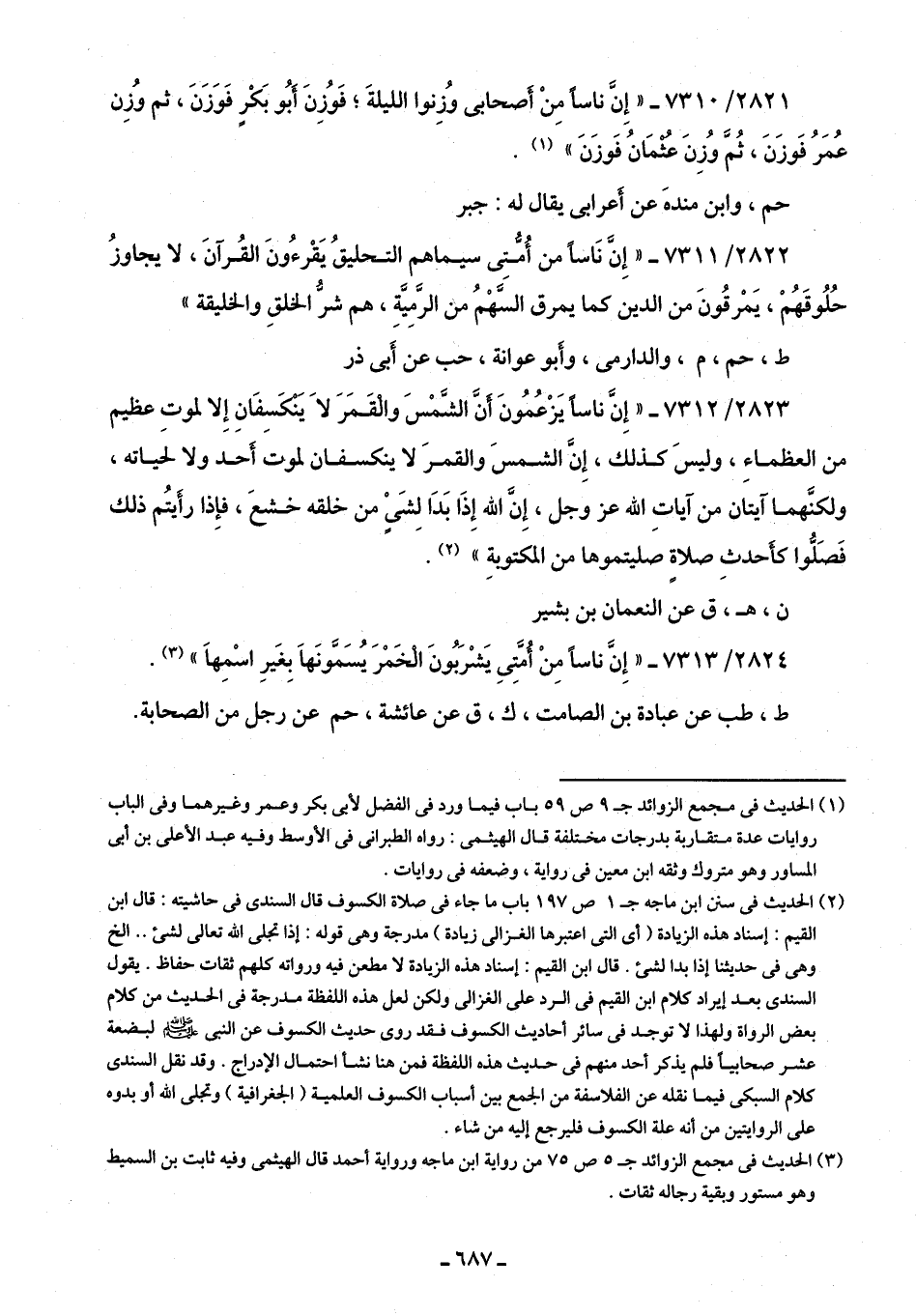 2824/ 7313 - "إِنَّ ناسًا مِنْ أُمَّتِى يَشْرَبُونَ الْخَمْرَ يُسَمَّونَها بِغَيرِ اسْمِها" (¬3).