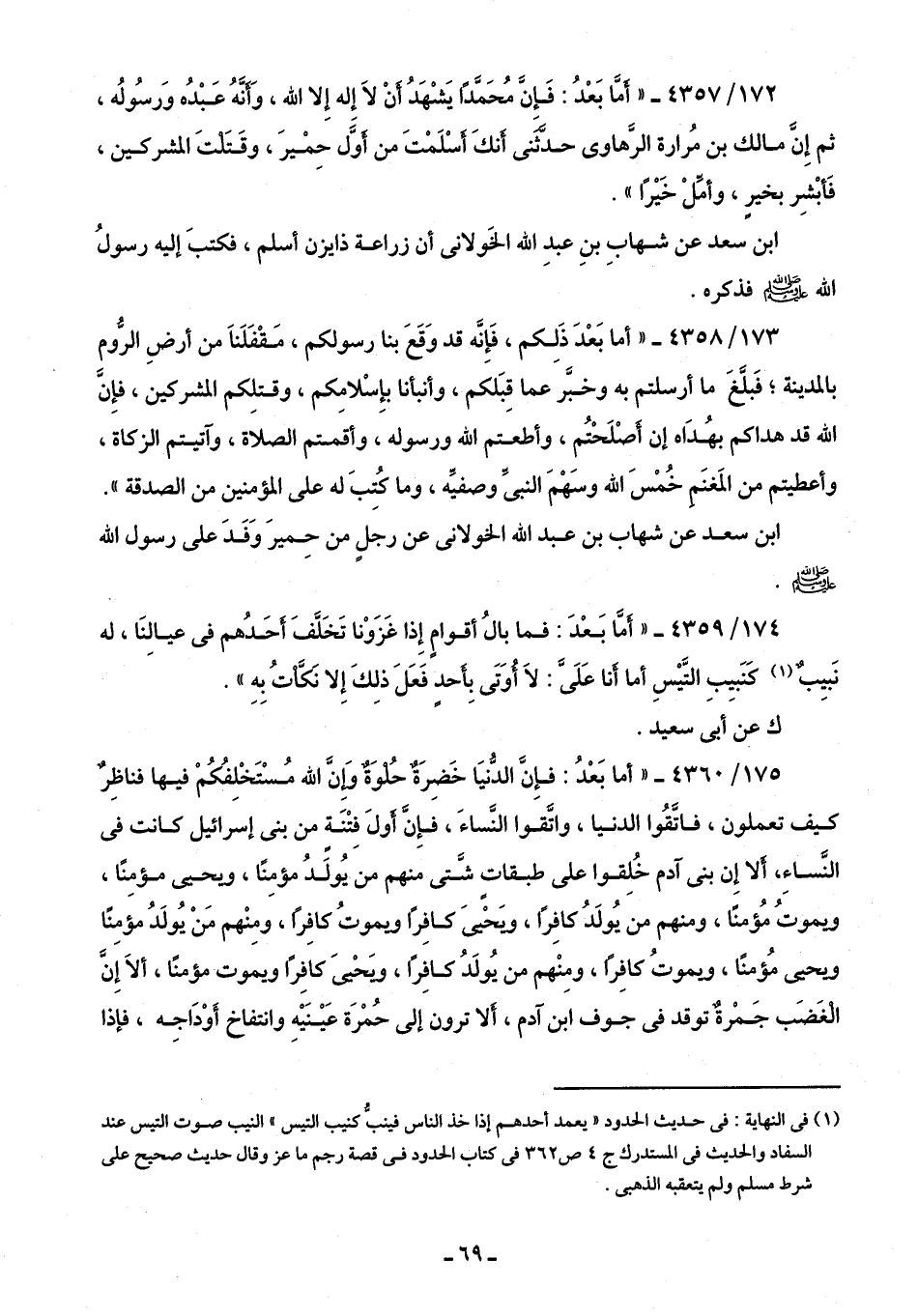 172/ 4357 - "أمَّا بَعْدُ: فَإِن مُحَمدًا يَشْهَدُ أنْ لَا إِله إِلا الله، وَأنَّهُ عَبْدُه وَرسُولُه، ثم إِن مالك بن مُرارة الرهاوى حدثني أنكَ أسْلَمْتَ من أوَّل حِمْيرَ، وقَتَلتَ المشركين، فَأبْشِر بخير، وأمِّلْ خَيرًا".