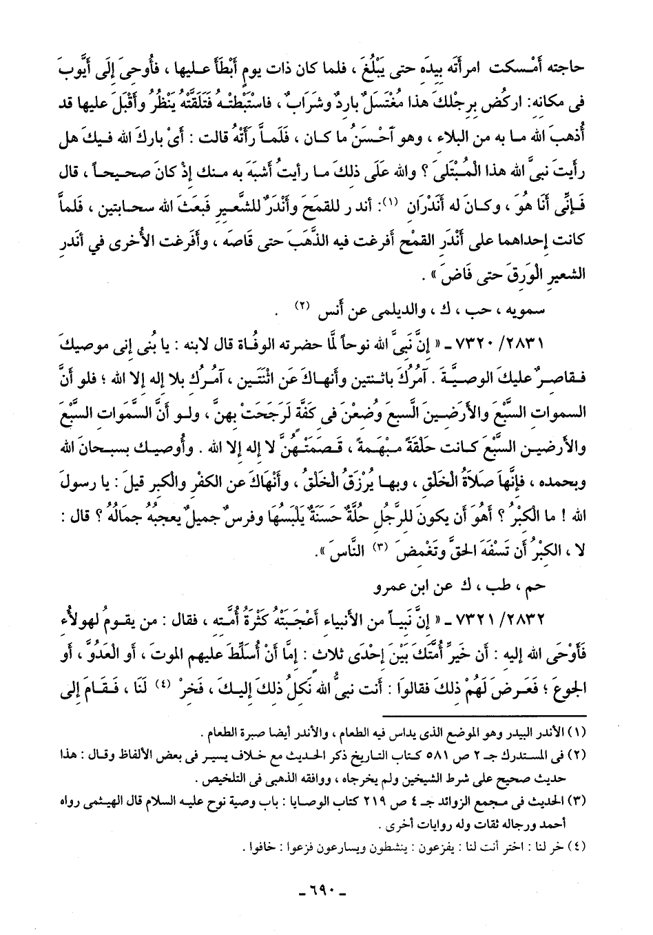 2831/ 7320 - "إِنَّ نَبِىَّ اللَّه نوحًا لمَّا حضرته الوفُاة قال لابنه: يا بُنى إِنى موصيكَ فقاصِرٌ عليكَ الوصيَّةَ. آمُرُكَ باثنتين وأَنهاكَ عَن اثْنَتَين، آمُرُكِ بلا إِله إِلا اللَّه؛ فلو أَنَّ السمواتِ السَّبْعَ والأَرَضِينَ السَّبعَ وضُعْنَ فِى كَفَّةٍ لَرَجَحَتْ بِهنَّ، ولو أَنَّ السَّمَواتِ السَّبْعَ والأَرضين السَّبْعَ كانت حَلْقَةً مبْهَمةً، قَصَمَتْهُنَّ لا إِله إِلا اللَّه. وأُوصيك بسبحانَ اللَّه وبحمده، فإنَّها صَلَاةُ الْخَلْقِ، وبها يُرْزَقُ الْخَلْقُ، وأَنْهَاكَ عن الكفْرِ والْكبِر قيلَ: يا رسولَ اللَّه! ما الكْبْرُ؟ أَهُوَ أَن يكونَ للِرَّجُلِ حُلَّةٌ حَسَنَةٌ يَلْبَسُهَا وفرسٌ جميلٌ يعجبُهُ جمَالُهُ؟ قال: لا، الكِبْرُ أَن تَسْفَة الحقَّ وتَغْمِضَ (¬3) النَّاسَ".
