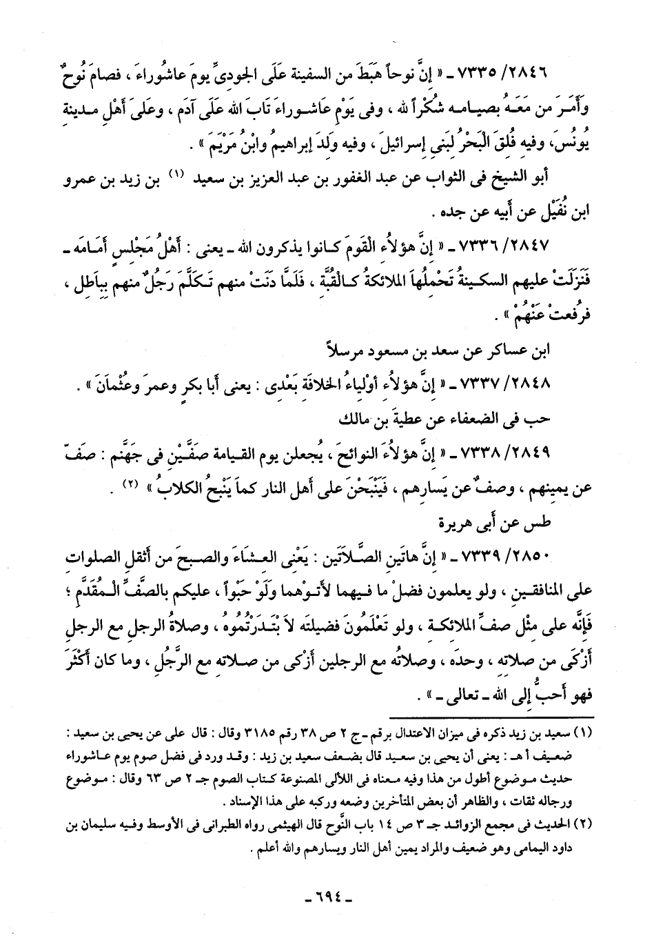 (¬1) سعيد بن زيد ذكره في ميزان الاعتدال برقم - ج 2 ص 38 رقم 3185 وقال: قال على عن يحيى بن سعيد: ضعيف أهـ: يعنى أن يحيى بن سعيد قال بضعف سعيد بن زيد: وقد ورد في فضل صوم يوم عاشوراء حديث موضوع أطول من هذا وفيه معناه في اللآلئ المصنوعة كتاب الصوم جـ 2 ص 63 وقال: موضوع ورجاله ثقات، والظاهر أن بعض المتأخرين وضعه وركبه على هذا الإسناد.