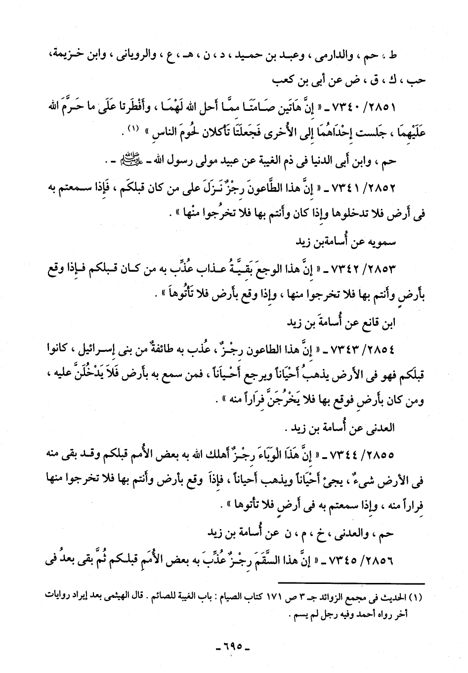 2855/ 7344 - "إِنَّ هذَا الْوَبَاءَ رِجْزٌ أَهلك اللَّه به بعض الأُمم قبلكم وقد بقى منه في الأرض شئٌ، يجئ أَحْيَانًا ويذهب أَحيانًا، فإِذا وقع بأرض وأَنتم بها فلا تخرجوا منها فِرارًا منه، وإِذا سمعتم به في أَرضٍ فلا تأتوها".