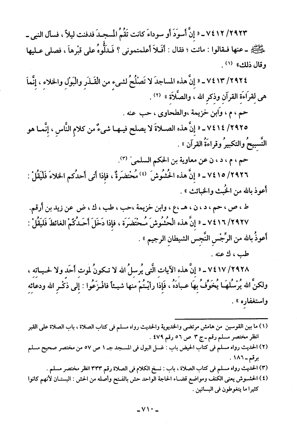2924/ 7413 - "إِنَّ هذه المساجدَ لا تَصْلُحُ لشئٍ من الْقَذَرِ والْبَوْلِ والخلاء، إِنَّمَا هى لِقرَاءَةِ القرآنِ وذِكرِ اللَّه، والصَّلَاةِ" (¬2).