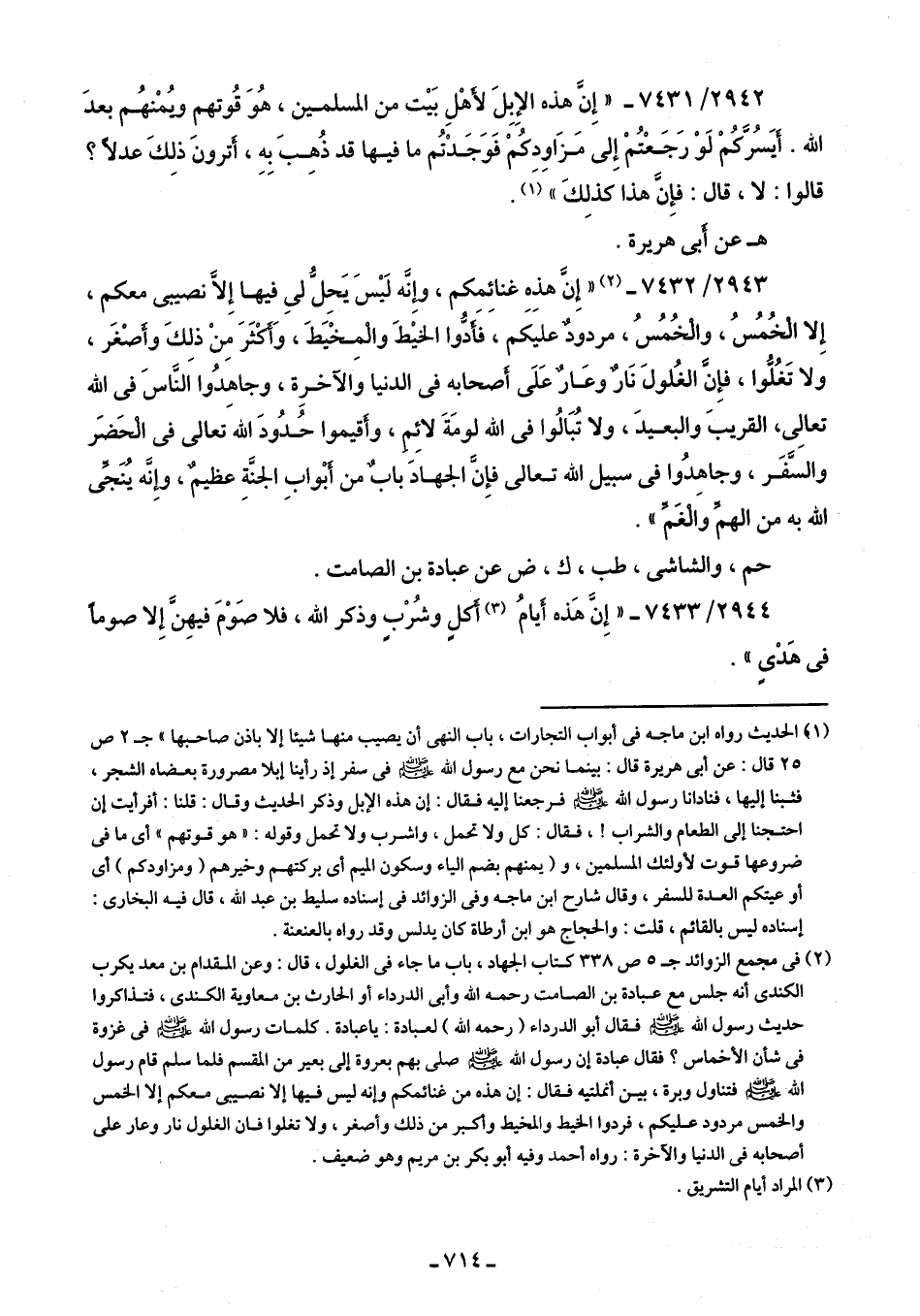2942/ 7431 - "إِنَّ هذه الإِبِلَ لأَهْلِ بَيْت من المسلمين، هُوَ قُوتهم ويُمْنهُم بعدَ اللَّه. أَيَسُرَّكُمْ لَوْ رَجَعْتُمْ إِلى مَزَاوِدكُمْ فَوَجَدْتُم ما فيها قد ذُهِبَ به، أَترونَ ذلكَ عدلًا؟ قالوا: لا، قال: فإِنَّ هذا كذلِكَ" (¬1).