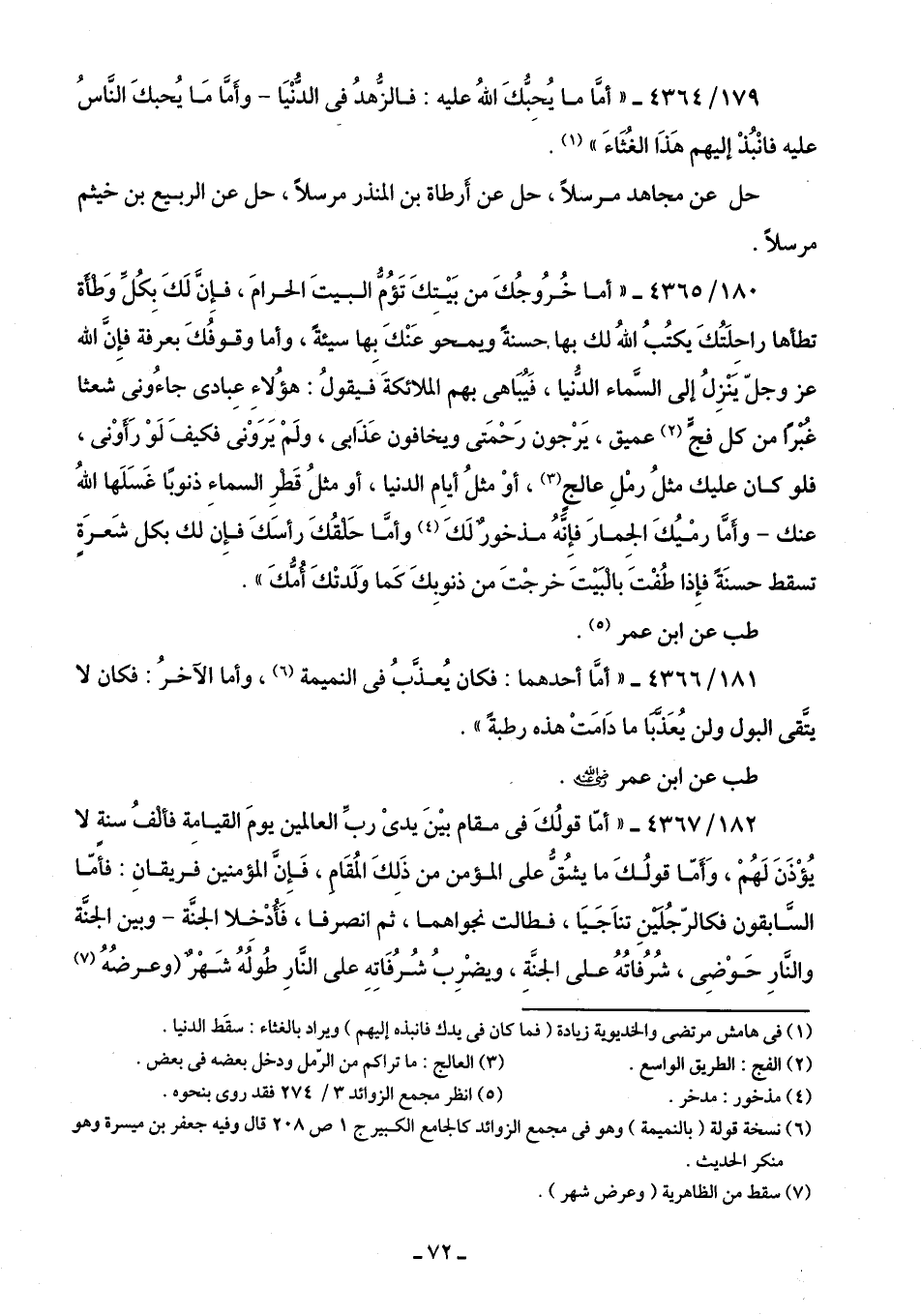 180/ 4365 - "أما خُرُوجُكَ من بَيتِكَ تَؤُمُّ البيتَ الحرامَ، فإِن لَكَ بِكُلِّ وَطأة تطأها راحِلَتُكَ يكتُبُ اللهُ لك بها، حسنةً ويمحو عَنْكَ بِها سيئةً، وأما وقوفُكَ بعرفة فإِن الله عَزَّ وَجَلَّ يَنْزِلُ إلى السَّماء الدُّنيا، فَيُبَاهى بهم الملائكةَ فيقولُ: هؤُلاءِ عِبادى جاءُونى شعثا غبرًا من كل فجٍّ (¬2) عميق، يَرْجون رَحْمَتى ويخافون عَذَابى، ولَمْ يَرَوْنى فكيفَ لَوْ رَأوْنى، فلو كان عليك مثلُ رمْلِ عالجٍ (¬3)، أوْ مثلُ أيام الدنيا، أو مثلُ قَطرِ السماءِ ذنوبًا غَسَلَها اللهُ عنك -وأمَّا رمْيُكَ الجِمارَ فإنَّهُ مذخورٌ لَكَ (¬4) وأمَّا حَلقُكَ رأسَكَ فإِن لك بكل شَعرَةٍ تسقط حسنَةً فإِذا طُفْتَ بالبَيتَ خرجْتَ من ذنوبِكَ كَما وَلَدتْكَ أُمُّكَ".