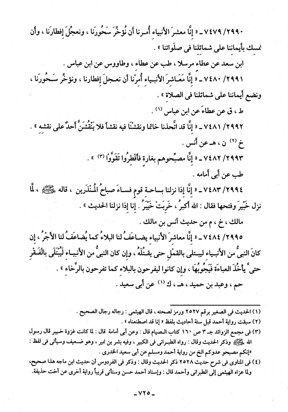 2991/ 7480 - "إِنَّا مَعَاشِرَ الأنبياءِ أُمِرْنا أن نعجلَ إِفطارنا، ونؤخِّر سَحُورَنا، ونضع أيماننا على شمائلنا في الصلاةِ".