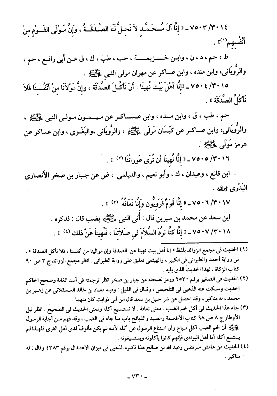 3015/ 7504 - "إِنَّا أهْلَ بَيْت نُهينَا: أنْ نَأْكُلَ الصَّدَقَة، وإِنَّ مَوْلَانَا مِنْ أنْفُسِنَا فَلَا نَأْكُلُ الصَّدَقَة".