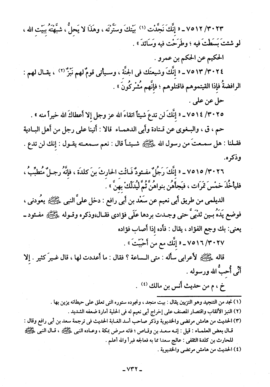 3023/ 7512 - "إِنَّكَ نَجَّدْت (¬1) بَيْتكَ وسَتَّرْتَه، وهَذَا لا يَحِلُّ، شبَّهْتَهُ بِبَيْتِ اللَّه، لو شئتَ بَسَطتَ فيه؛ وطَرَحْت فيه وَسَائدَ".