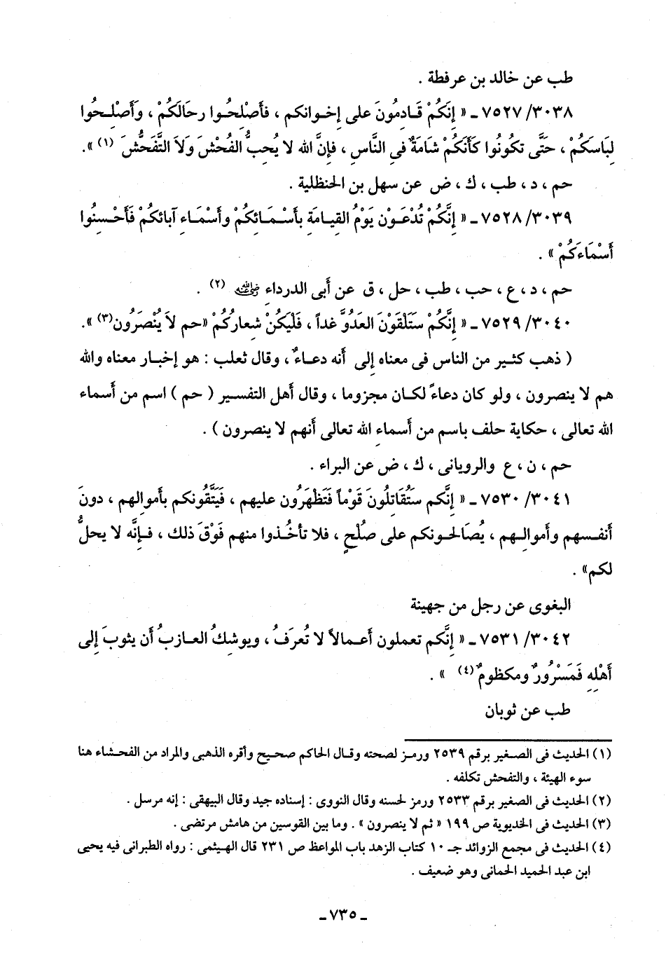 3038/ 7527 - "إِنَّكُمْ قَادِمُونَ على إِخوانكم، فأصْلِحُوا رحَالَكُمْ، وَأصْلحُوا لِبَاسَكُمْ، حَتَّى تكُونُوا كَأَنَّكُمْ شَامَةٌ فِى النَّاسِ، فإِنَّ اللَّه لا يُحِبُّ الفُحْشَ وَلَا التَّفَحُّشَ (¬1) ".