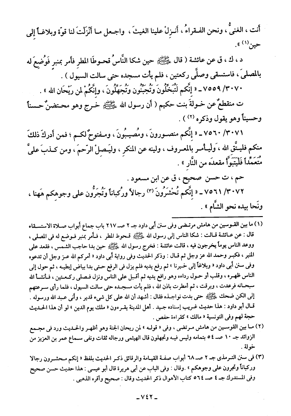 3072/ 7561 - "إِنَّكم تُحْشَرُونَ (¬3) رجالًا ورُكبانًا وَتُجَرُّون على وجوهِكم هَهنا، ونَحا بيده نحو الشَّام".