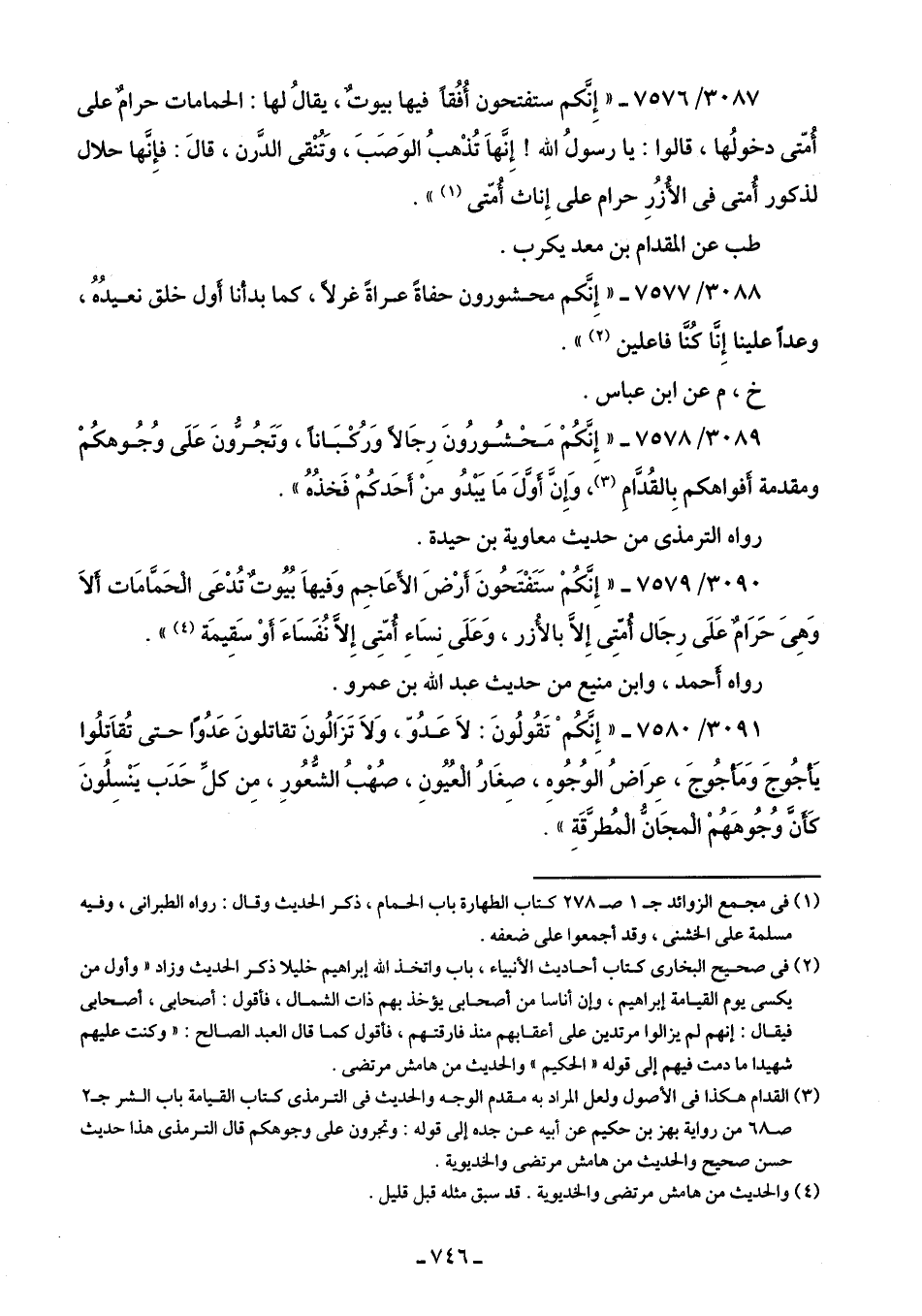 3090/ 7579 - "إِنَّكُمْ سَتَفْتَحُونَ أَرْضَ الأَعَاجِم وَفيها بُيُوتٌ تُدْعَى الحَمَّامَات ألَا وَهِى حَرَامٌ عَلَى رِجَال أُمّتِى إِلَّا بالأُزر، وَعَلَى نِسَاءِ أُمّتِى إِلَّا نُفَسَاءَ أوْ سَقِيمَة (¬4) ".