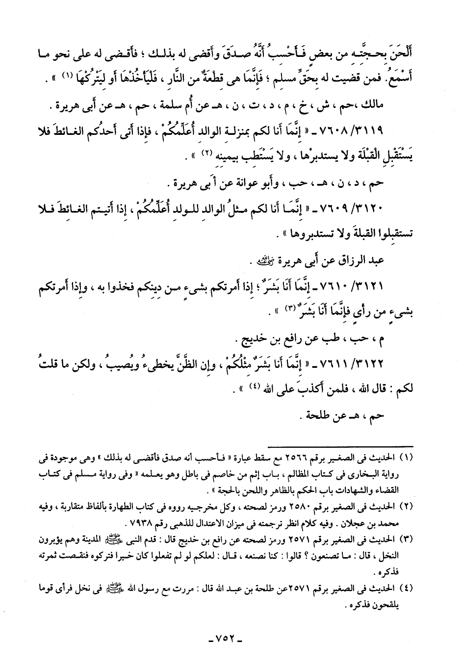 3122/ 7611 - "إِنَّمَا أَنَا بَشَرٌ مِثْلُكُمْ، وإِن الظَّنَّ يخطئُ ويُصيبُ، ولكن ما قلتُ لكم: قال اللَّه، فلمن أَكذبَ على اللَّه (¬4) ".