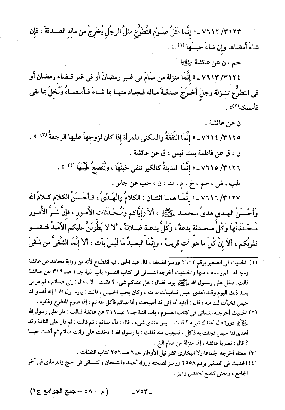 3124/ 7613 - "إِنَّمَا منزلة من صَامَ في غير رمضانَ أو في غير قضاءِ رمضان أَو في التطوُّع بمنزلة رجلٍ أخرَجَ صدقةَ ماله فجاد منها بما شاءَ فأمضاهُ وَبَخِلَ بما بقى فأمسكه (¬2) ".