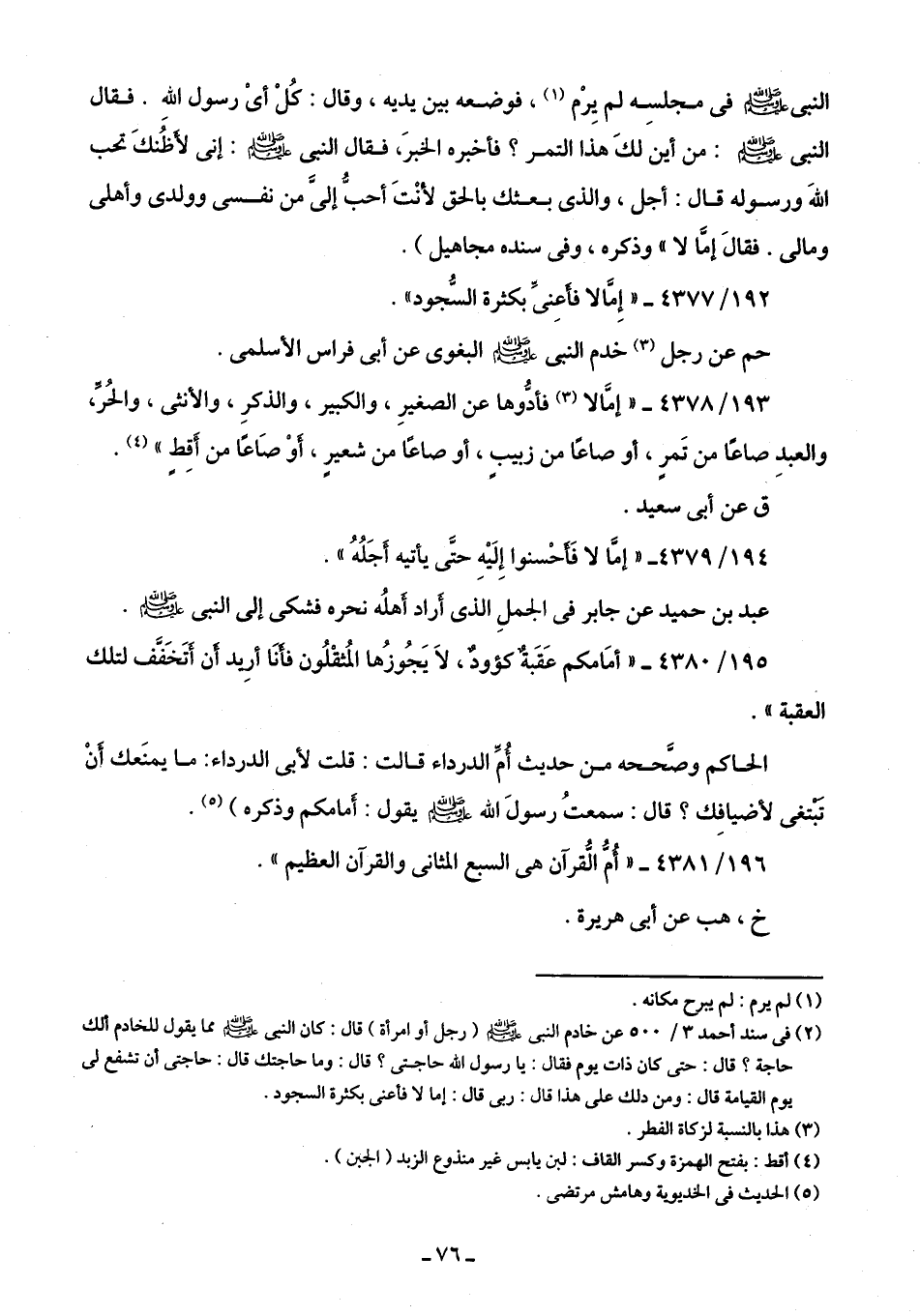 (¬2) في سند أحمد 3/ 500 عن خادم النبي - صلى الله عليه وسلم - (رجل أو امرأة) قال: كان النبي - صلى الله عليه وسلم - مما يقول للخادم ألك حاجة؟ قال: حتى كان ذات يوم فقال: يا رسول الله حاجتى؟ قال: وما حاجتك قال: حاجتى أن تشفع لي يوم القيامة قال: ومن ذلك على هذا قال: ربى قال: إما لا فأعنى بكثرة السجود.